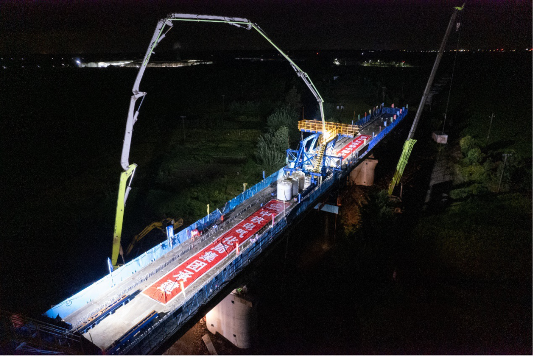 据新华社盐城9月14日电 9月14日凌晨2时18分,在江苏盐城,随着最后一方混凝土入模,由中铁电气化局铁路工程公司参建的大丰港铁路支线工程跨沿海高速公路特大桥连续梁顺利实现合龙。这是大丰港铁路支线工程首座成功合龙的连续梁。