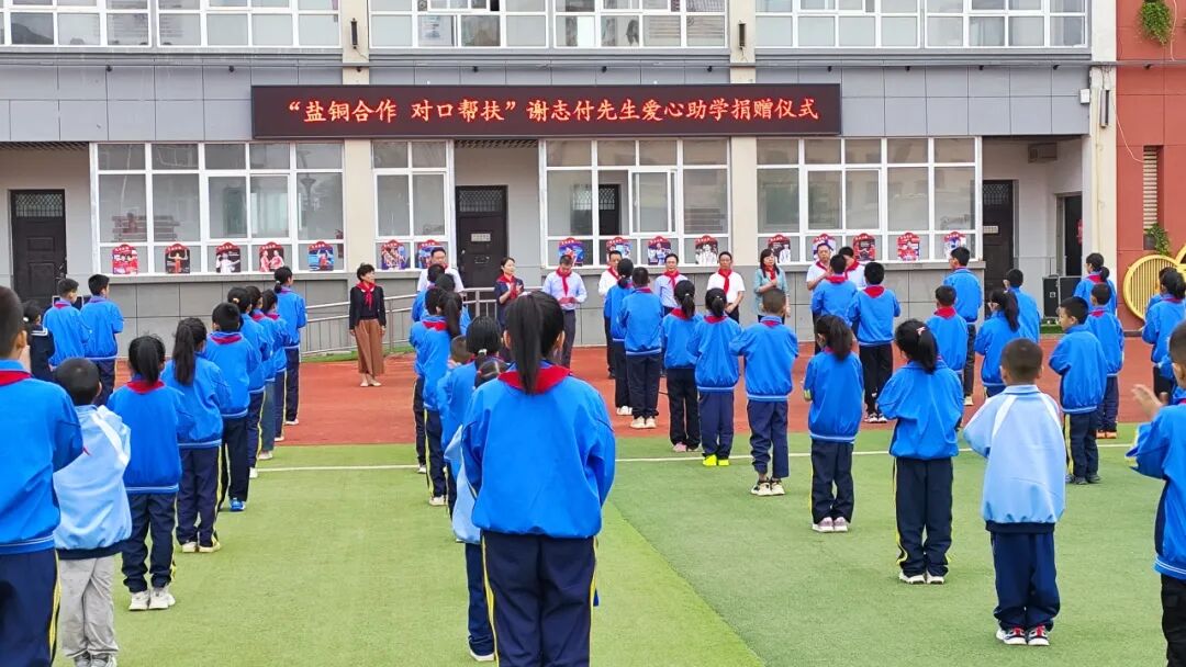 9月11日上午,在盐城和铜川两地红十字会牵线下,盐城爱心人士谢志付来到陕西省铜川市宜君县城关第二小学,向在这里学习的92名困难学子每人发放500元助学款,同时鼓励他们要珍惜来之不易的学习机会,树立远大理想,勤奋学习,用知识改变命运,用奋斗创造未来。