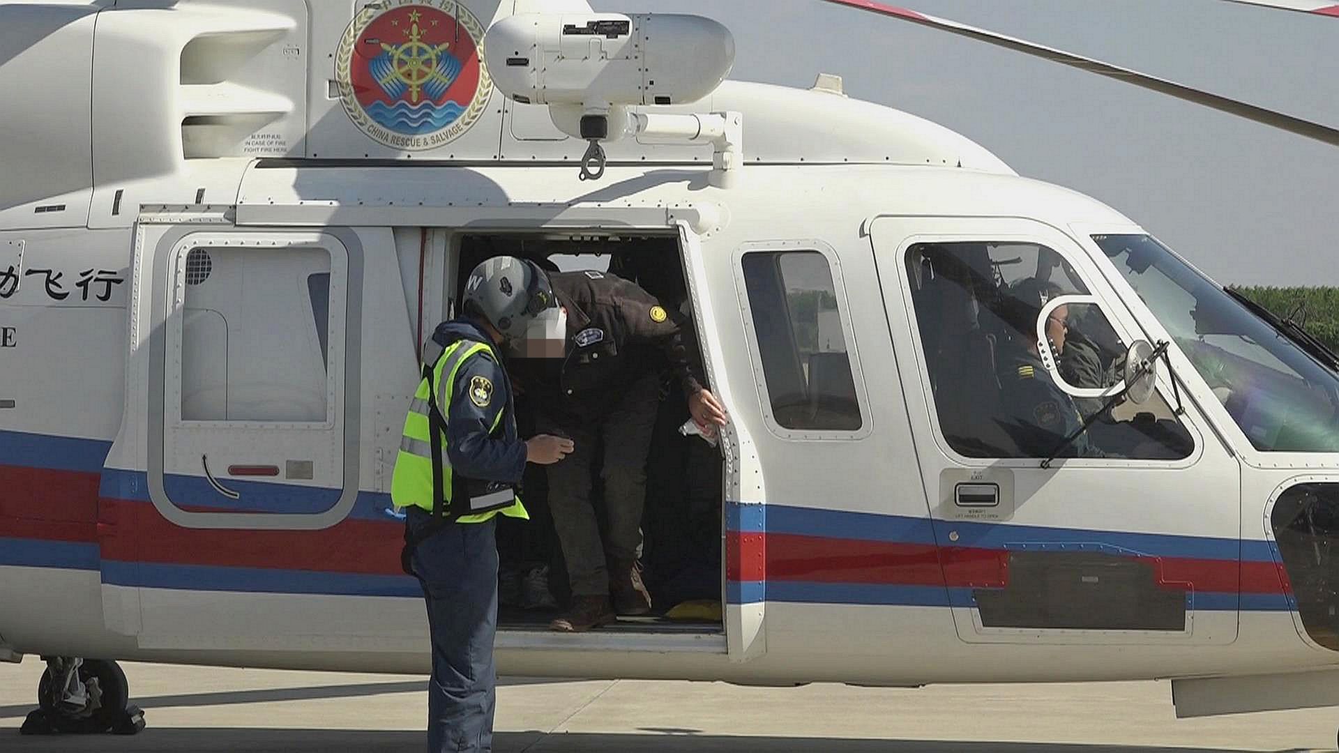 一艘渔船在进行捕捞作业时,船上的渔民头部被缆绳击伤,口吐鲜血,情况危急,交通运输部东海救助局迅速启动海上应急救援预案,快速指派直升机抵达,将受伤渔民悬吊上直升机,随后返回机场,并转送上120救护车。