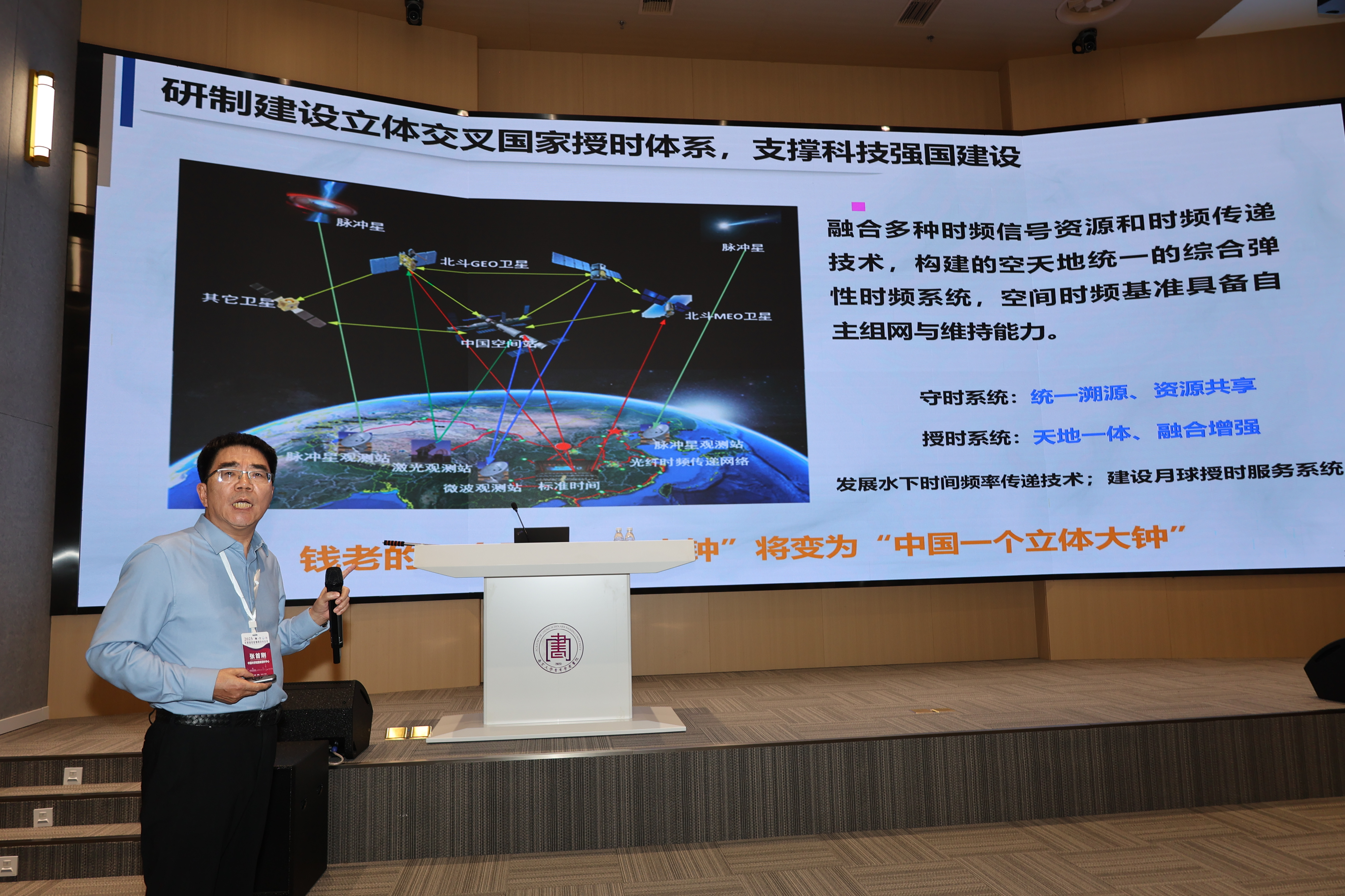 “国际首款光抽运小铯钟产品,打破美国垄断,已成功应用于国家标准时间系统;世界第二家成功研制铷喷泉守时钟的国家;铯喷泉基准钟,实现国家标准时间自主校准;实现世界时自主测量……”张首刚研究员在会上讲解了授时的原理、方法与技术,国民经济、日常生活和国家安全都离不开精准授时。他的一句“仅美国、中国能够自主研制国家标准时间产生所需的所有核心仪器设备”赢得与会人员的热烈掌声。