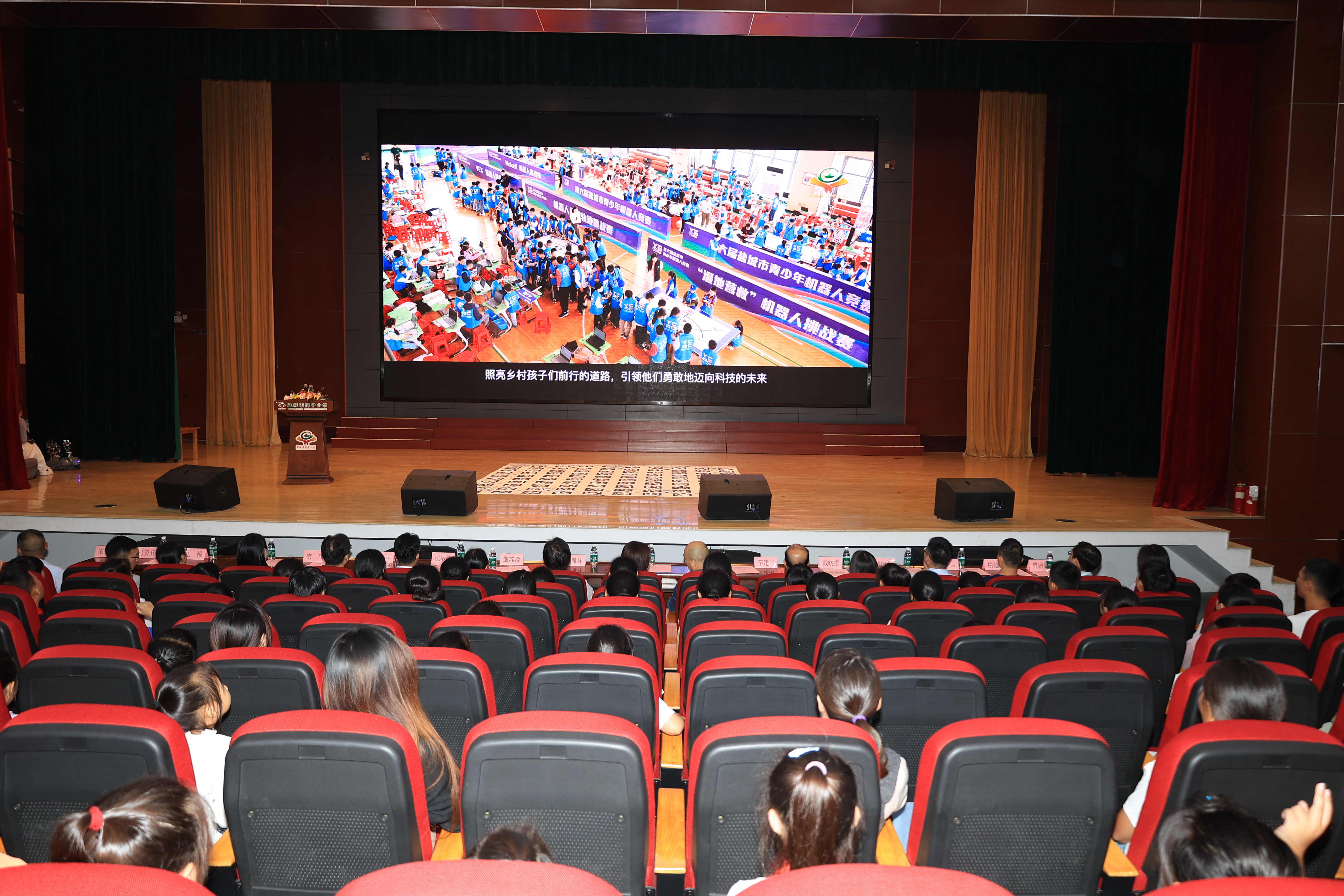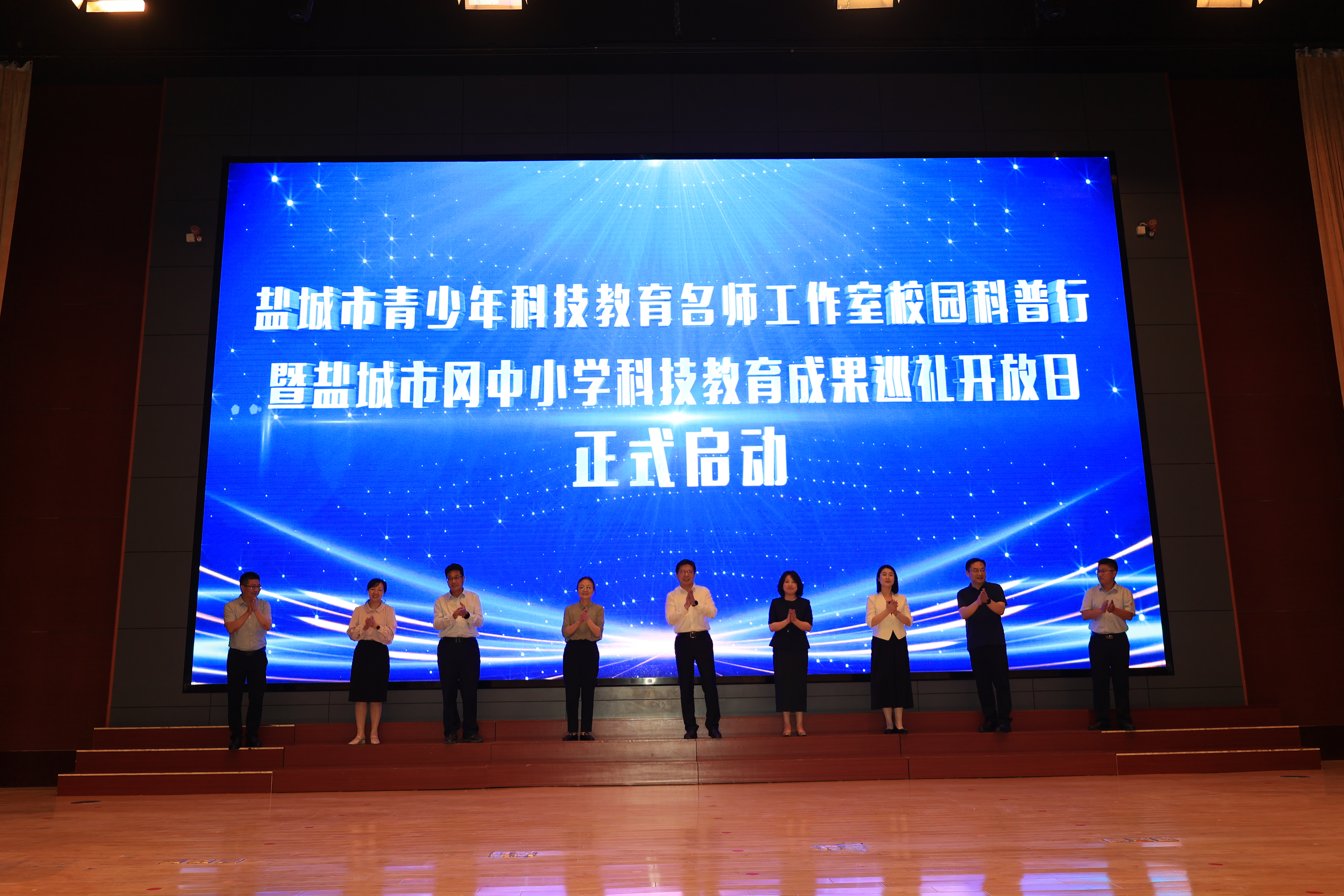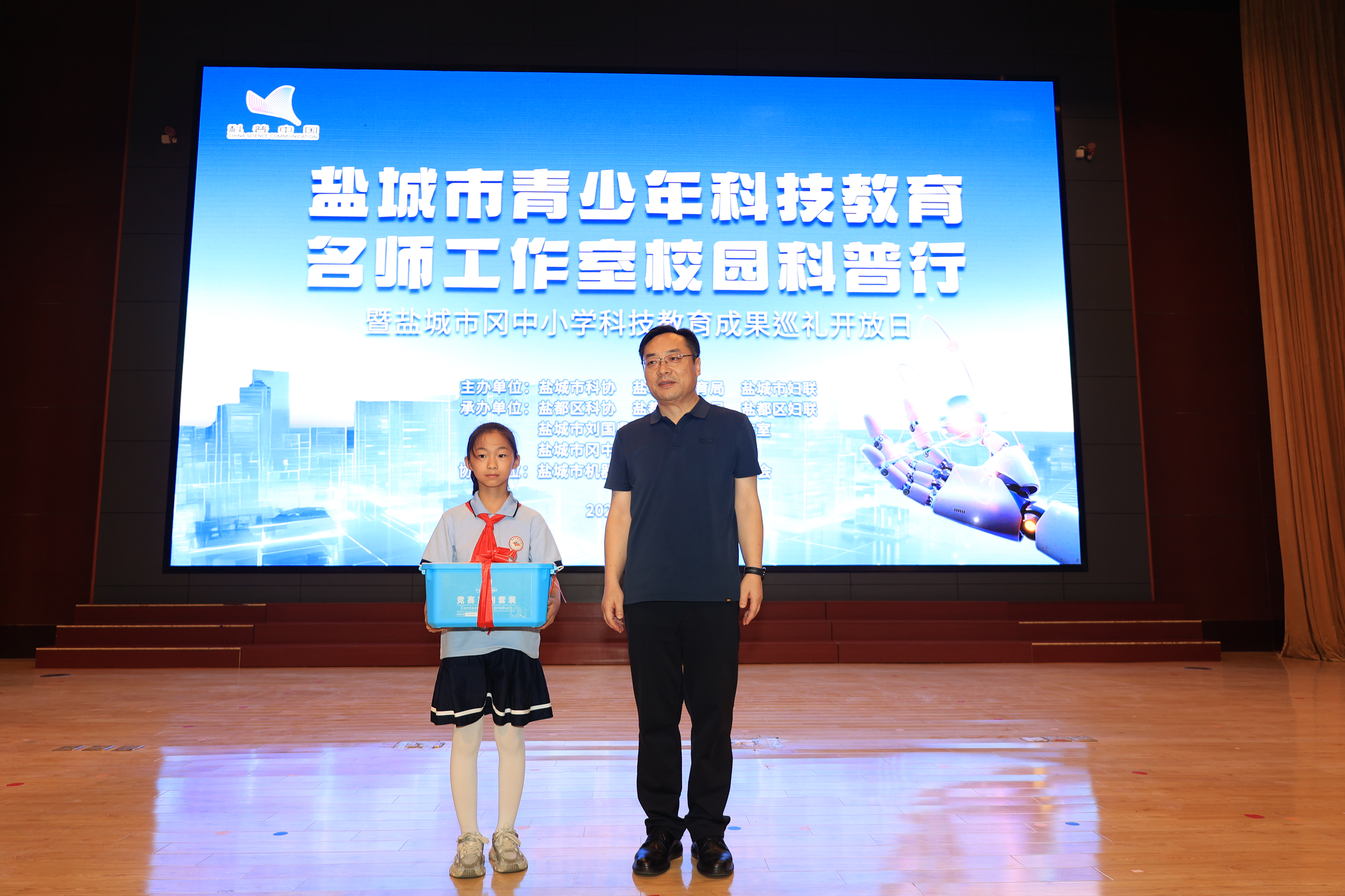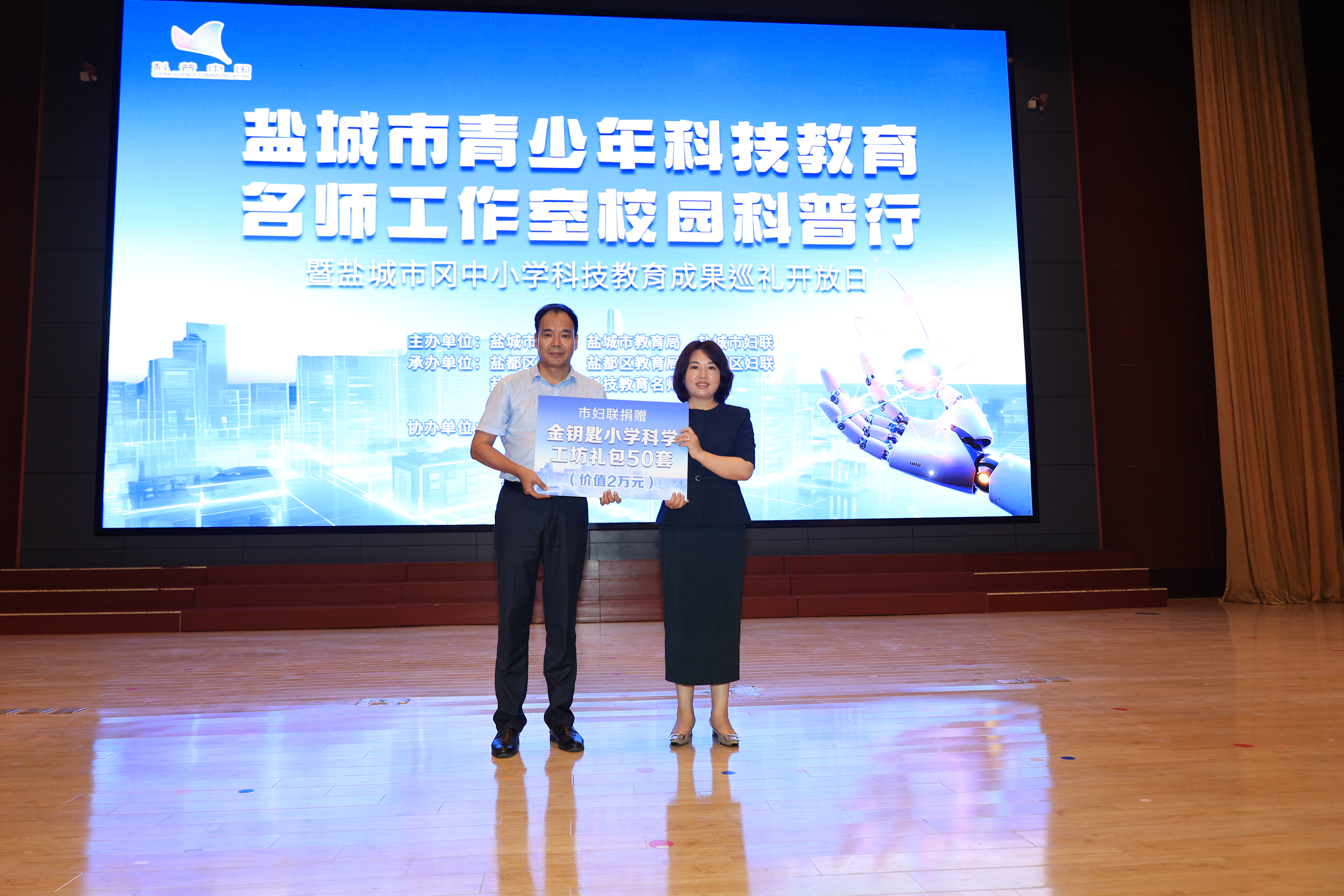 启动仪式上,无人机编队划出绚烂轨迹,机器人舞蹈点燃全场热情。盐都区领导作热情洋溢的致辞,随后的捐赠环节更显温情——市科协捐赠科普图书与科教器材、市妇联提供2万元“科学种子计划”项目资金、盐都区科协追加科教器材支持,多方合力为乡村科创教育注入新动能。随着与会嘉宾共同按下启动球,一场属于乡村少年的科技探索之旅正式启程。
