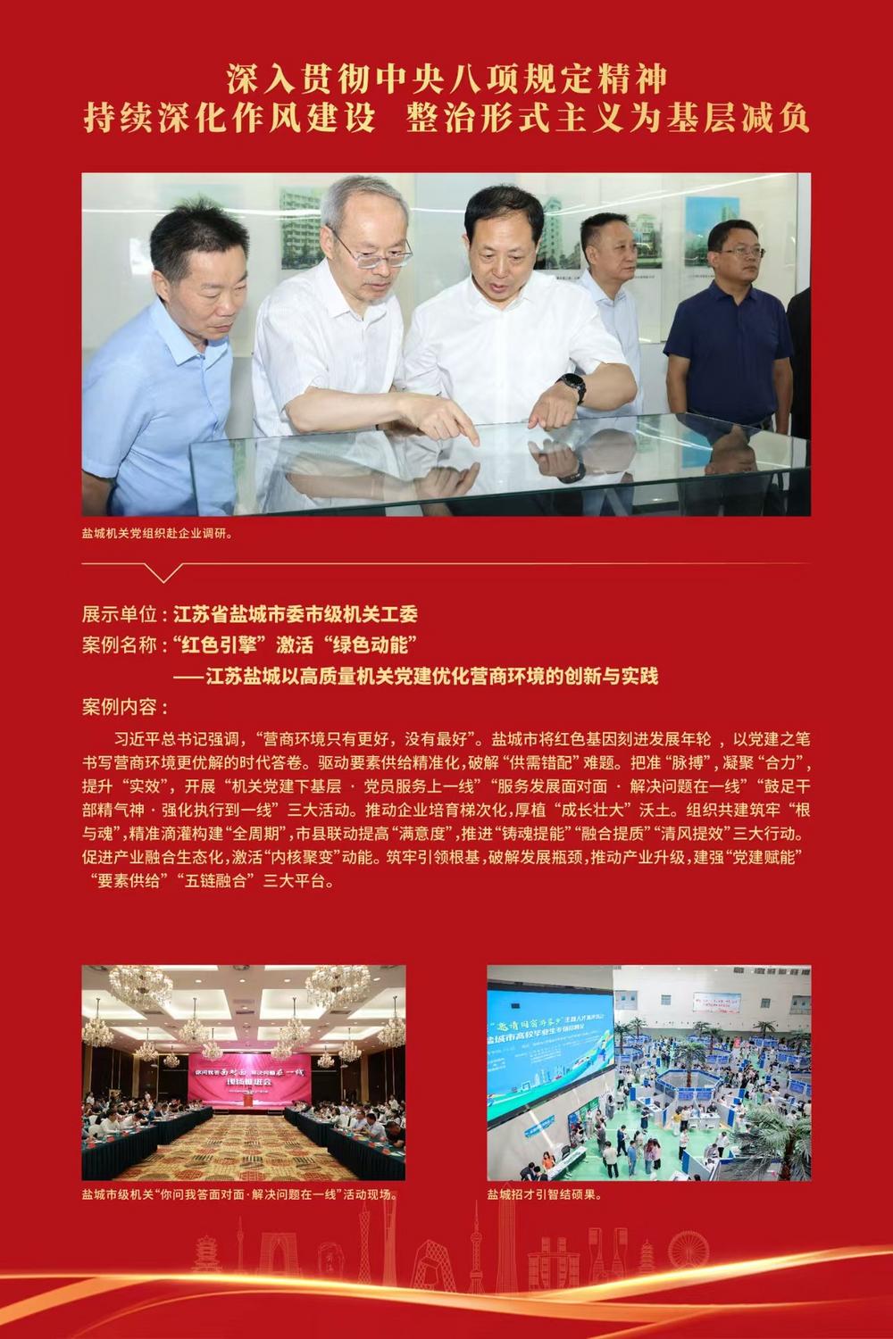 11月7日,第五届党建创新成果展示交流活动在深圳举办,全国机关党建工作者齐聚改革开放前沿,共探党建创新路径。盐城市委市级机关工委报送的《“红色引擎”激活“绿色动能”——以高质量机关党建优化营商环境的创新与实践》,成功入选“深入贯彻中央八项规定精神,持续深化作风建设,整治形式主义为基层减负”类别“全国十大示范案例”,并成为全省唯一现场展示交流的案例。