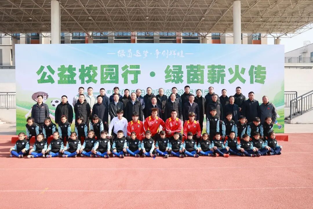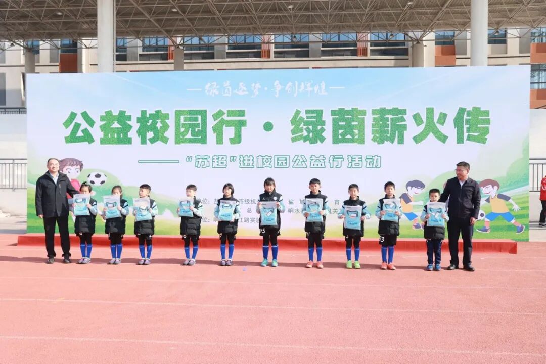 活动现场,一行人与“苏超”盐城队球员代表共同向学校以及⻘训学员捐赠签名足球、球包、球衣等物资并合影留念。