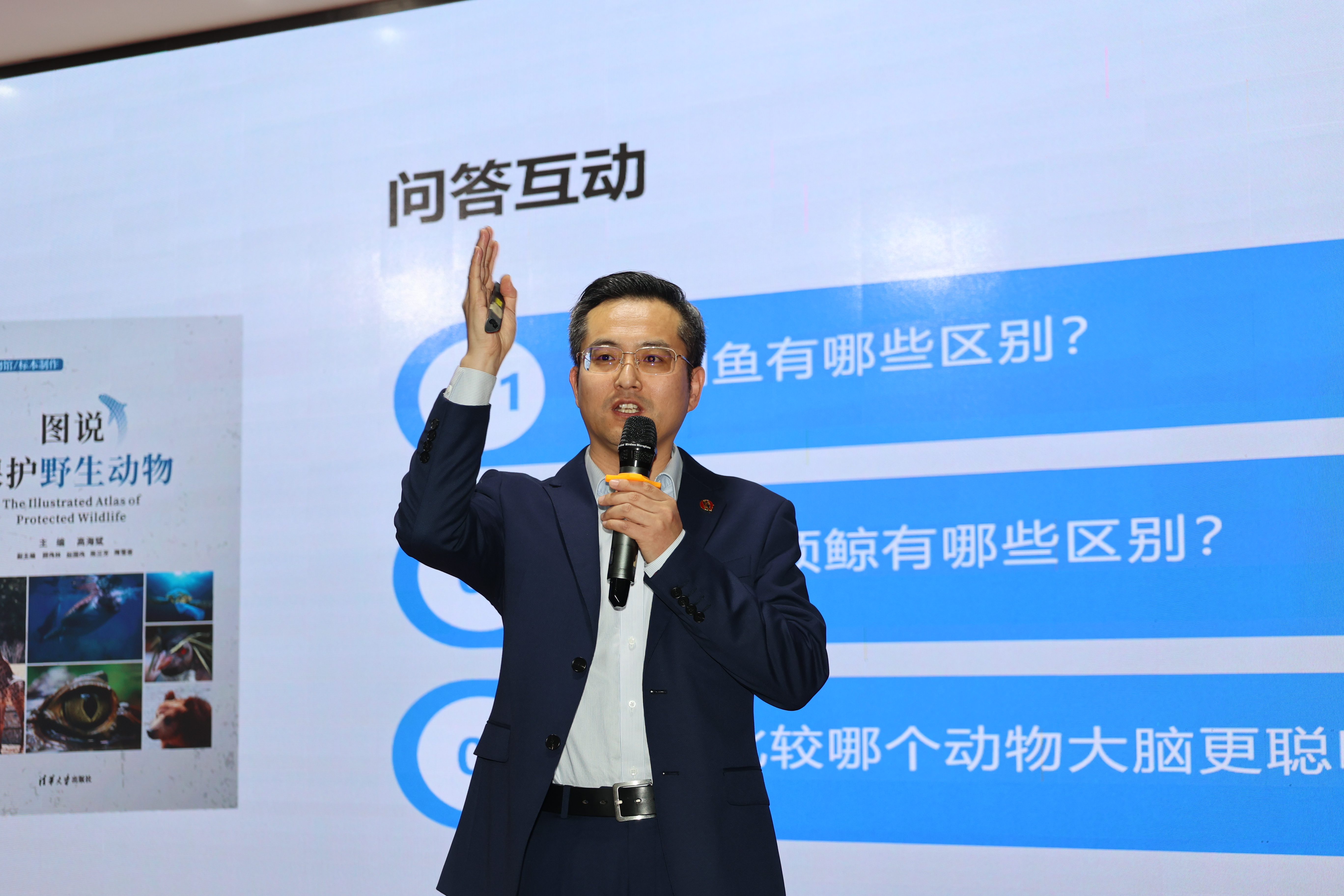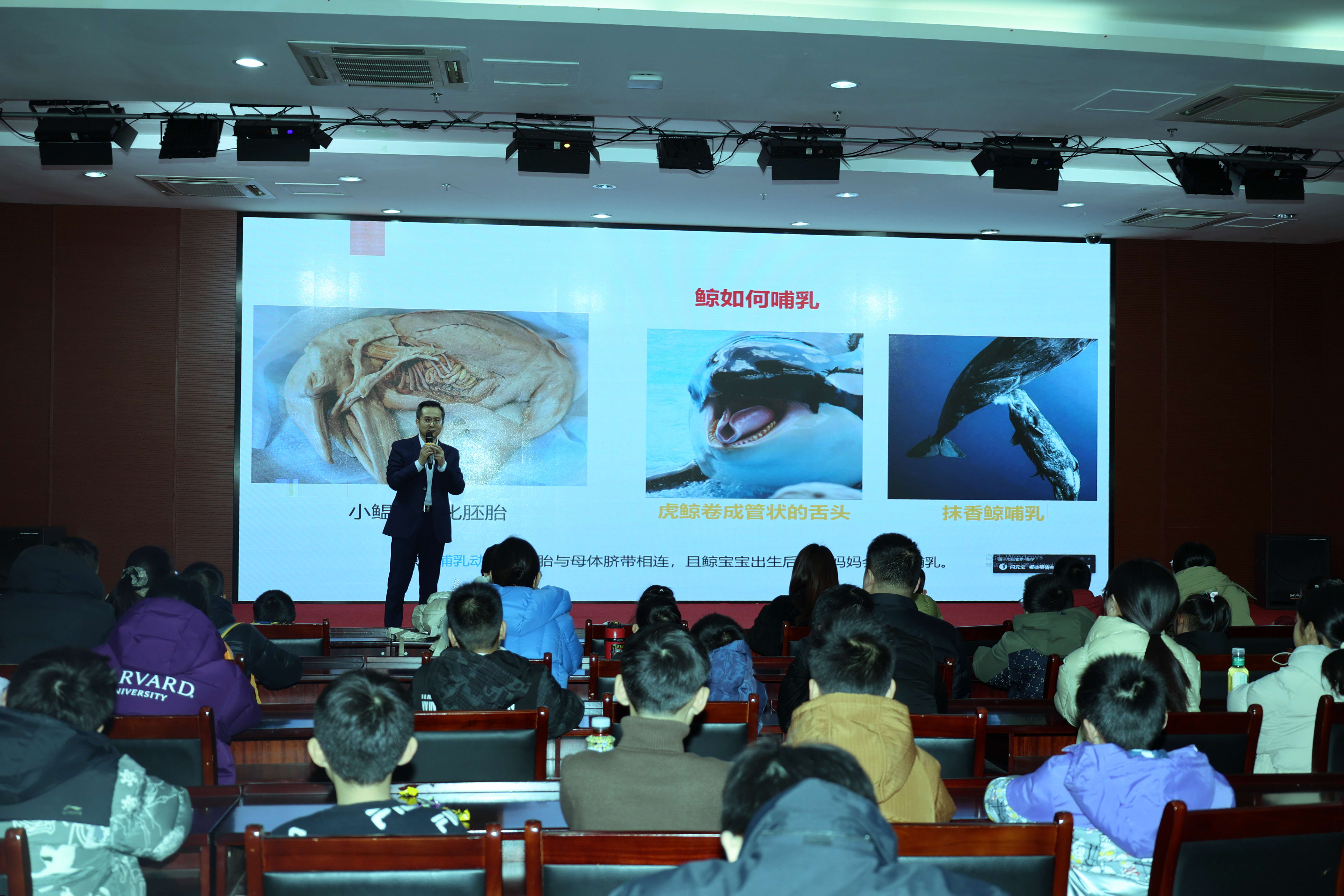 “减少塑料制品使用、做好垃圾分类、避免食物浪费这些力所能及的小事,实则是对海洋精灵最切实的帮助,每一位听众,都可能在日常生活中成为海洋保护的践行者。”高海斌在讲座中对鲸类家族的多样性及其精妙的生存智慧进行了深入剖析,重点介绍了齿鲸与须鲸两大类群在体型、食性、感官系统等方面的显著差异,特别是齿鲸赖以生存的生物声呐(回声定位)系统。他结合科研实例指出,海洋噪声污染等人为干扰可能影响该系统,导致鲸类导航失灵甚至群体搁浅,从而巧妙地将话题引向海洋生态保护。