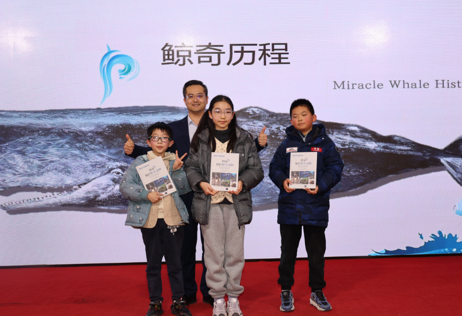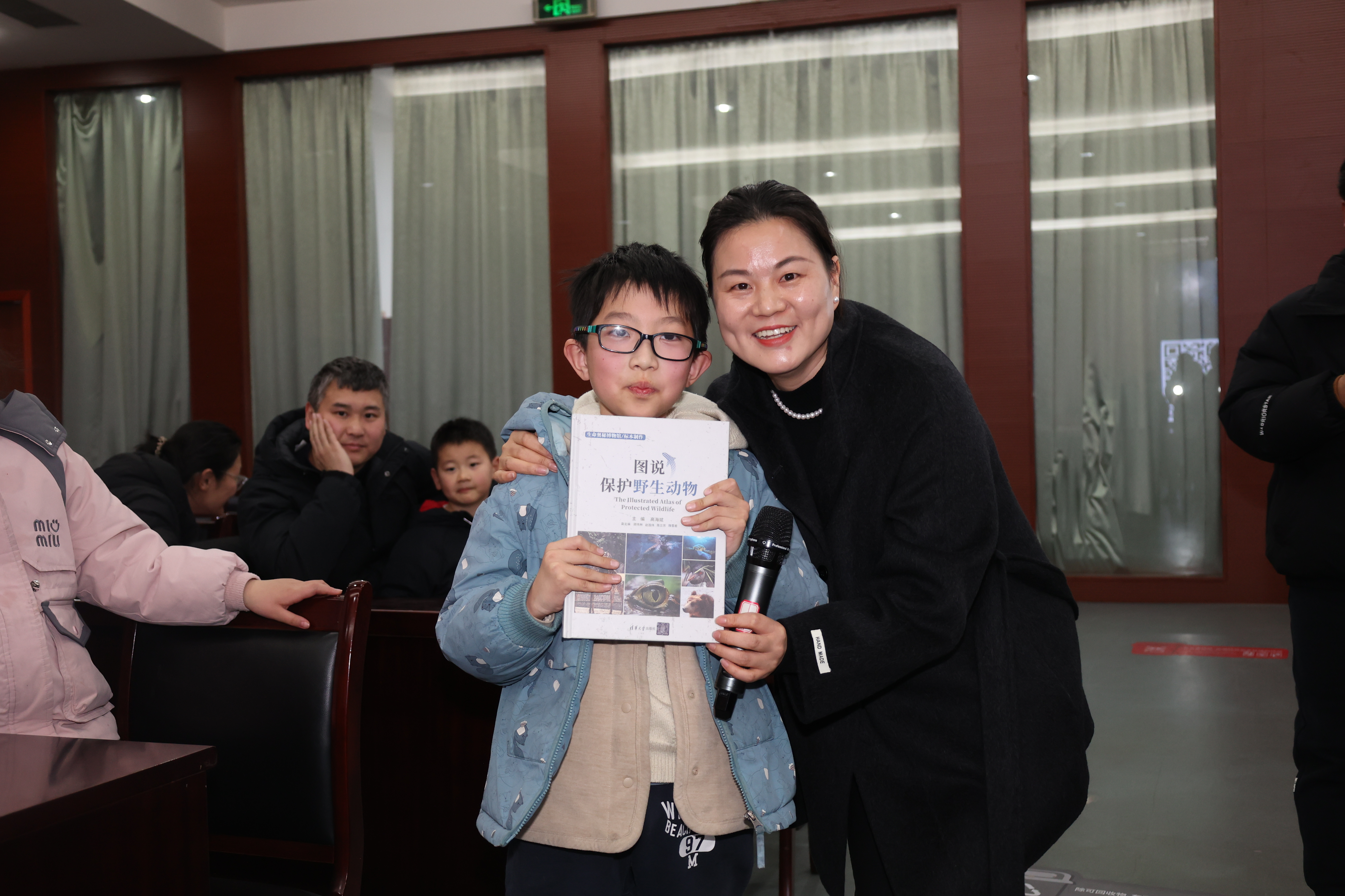 本次讲座座无虚席,不少对科技关注的家长陪同小孩一起来到现场听课。抢答互动环节,来自市区串场河小学四(2)班周毅州、四(5)班曹言蹊、五(14)班卢定堃三位同学准确回答了高海斌提出的鲸类区别、动物智力比较、海洋保护等问题,分别获得一本由他亲笔签名的《图说保护野生动物》科普图书并合影。