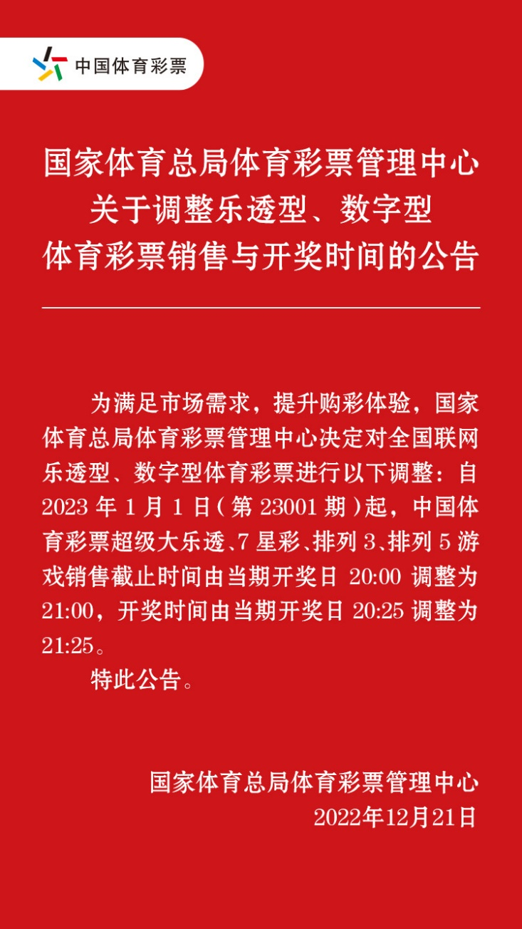 2023年1月1日(第23001期)起,大乐透、7星彩、排列3、排列5游戏销售截止时间由当期开奖日20:00调整为21:00,开奖时间由当期开奖日20:25调整为21:25。购彩者可通过电视、广播、网站、手机客户端、报纸等渠道查阅开奖信息。
