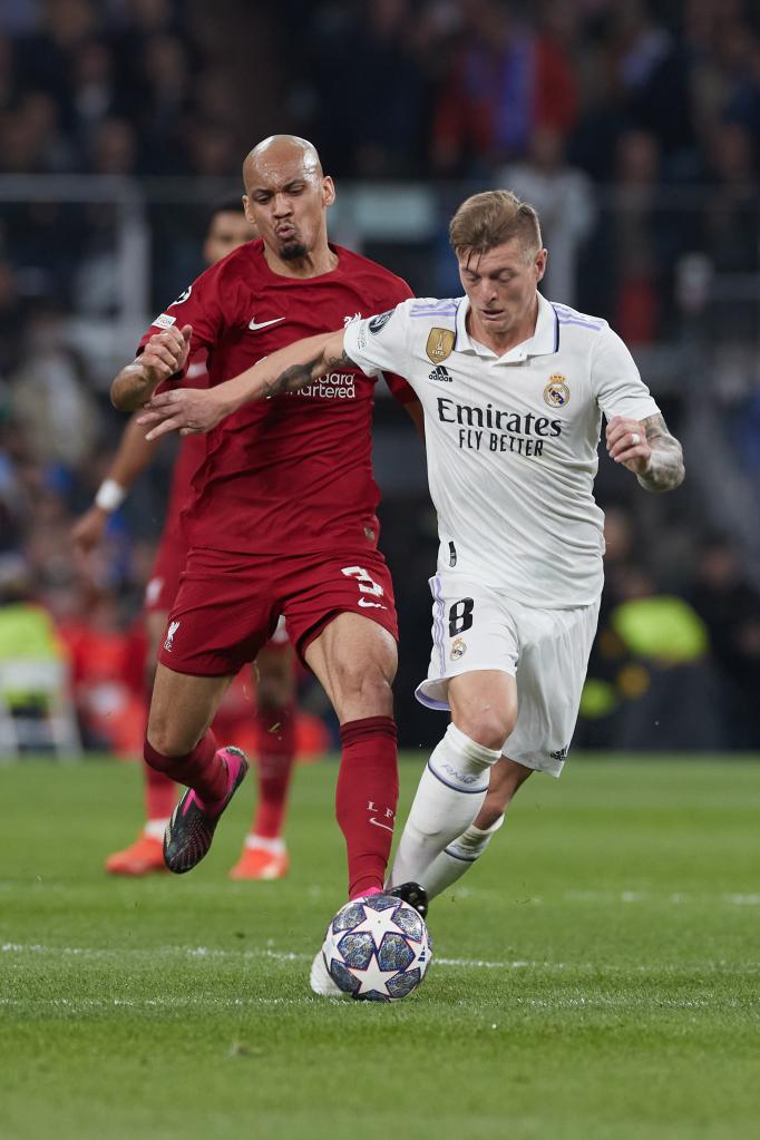 3月15日,皇马球员克罗斯(右)与利物浦球员法比尼奥在比赛中拼抢。新华社记者 孟鼎博 摄