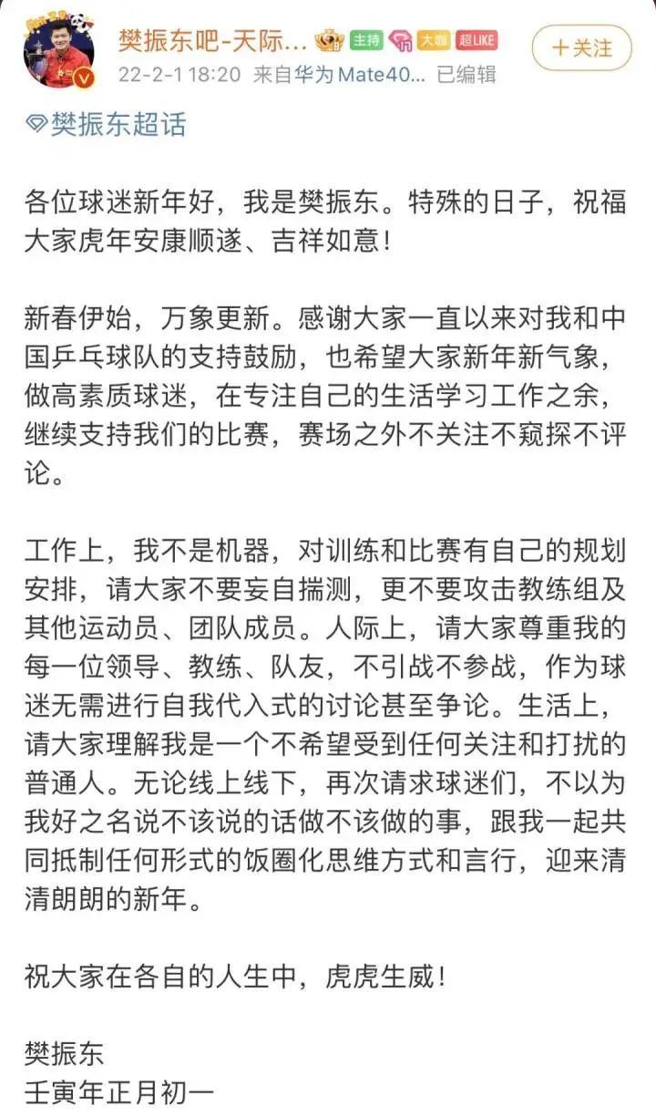 2022年正月初一,樊振东发文呼吁,“跟我一起共同抵制任何形式的饭圈化思维方式和言行,迎来清清朗朗的新年。”
