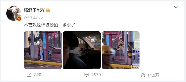 而在今年7月,面对代拍,杨舒予直接晒出对方照片,怒怼,“不喜欢这样被偷拍,求求了, ”