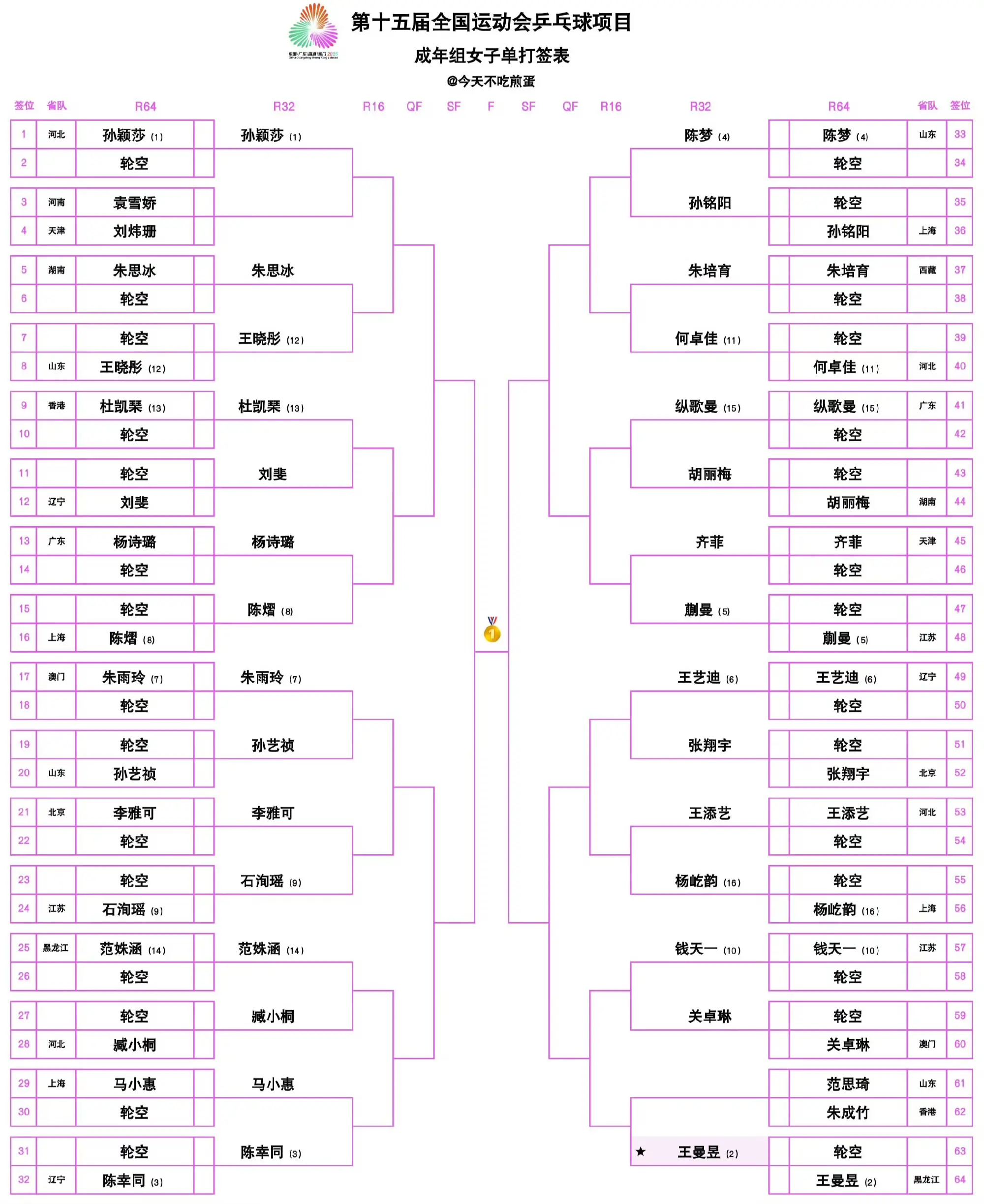 2025年第十五届全运会乒乓球女单赛事即将于11月7日拉开战幕,完整签表正式公布后引发热议。世界第一孙颖莎、卫冕冠军王曼昱作为种子选手首轮轮空,陈梦、陈幸同、王艺迪等名将悉数在列,蒯曼、陈熠等新生代黑马暗藏杀机,上中下三区各有焦点,全程看点十足。