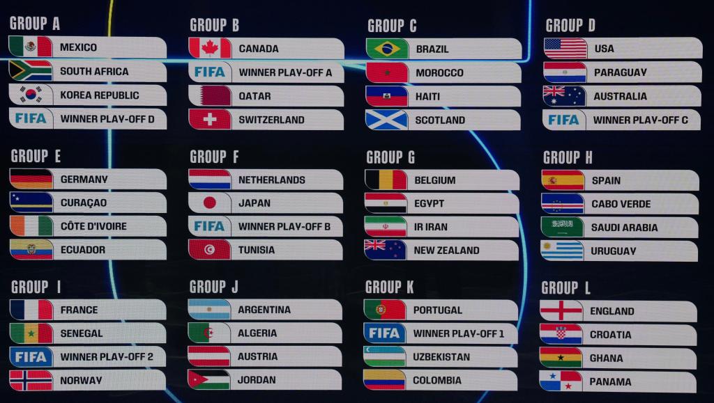 具体分组结果为:A组:墨西哥、南非、韩国、欧洲区附加赛D队;B组:加拿大、欧洲区附加赛A队、卡塔尔、瑞士;C组:巴西、摩洛哥、海地、苏格兰;D组:美国、巴拉圭、澳大利亚、欧洲区附加赛C队;E组:德国、库拉索、科特迪瓦、厄瓜多尔;F组:荷兰、日本、欧洲区附加赛B队、突尼斯;G组:比利时、埃及、伊朗、新西兰;H组:西班牙、佛得角、沙特阿拉伯、乌拉圭;I组:法国、塞内加尔、洲际附加赛2队、挪威;J组:阿根廷、阿尔及利亚、奥地利、约旦;K组:葡萄牙、洲际附加赛1队、乌兹别克斯坦、哥伦比亚;L组:英格兰、克罗地亚、加纳、巴拿马。