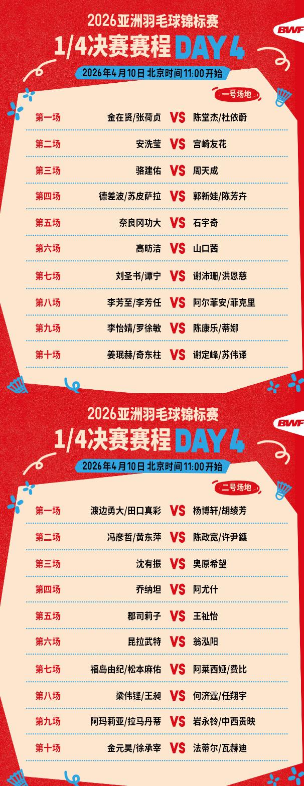 2026年亚洲羽毛球锦标赛今天(10日)迎来1/4决赛,将于北京时间11时开赛。