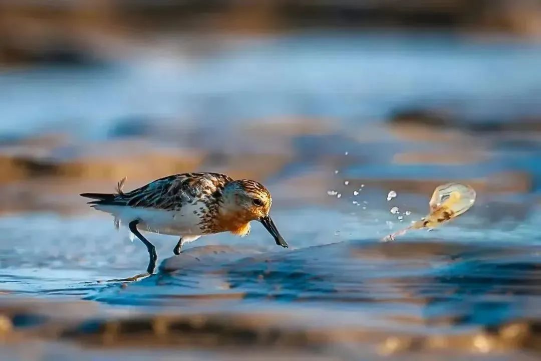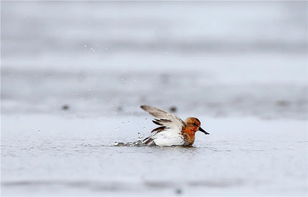 勺嘴鹬是小型涉禽,体长约14-16厘米,体重约40克,体型仅有麻雀般大小,有勺子状的嘴型,因此而得名。繁殖期时,勺嘴鹬的头部和胸部呈红色,腹部白色,背部主要为黄褐色;非繁殖期时,其头部和胸腹部呈现白色,背部为灰色。