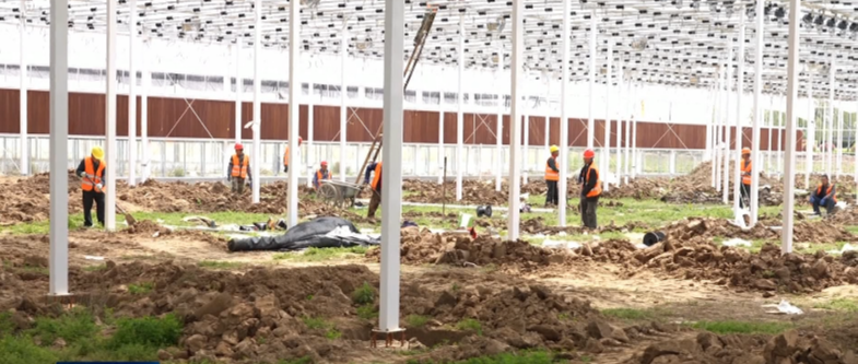 亭湖现代农业产业示范园发展有限公司法人陈华介绍道:目前整个智能玻璃温室项目已经完成80%左右,温室大棚主体建筑已全部完工,水肥系统正在施工中,所需种植的辣椒苗、黄瓜苗已经全部到位,下一步进行场地平整,准备种植。