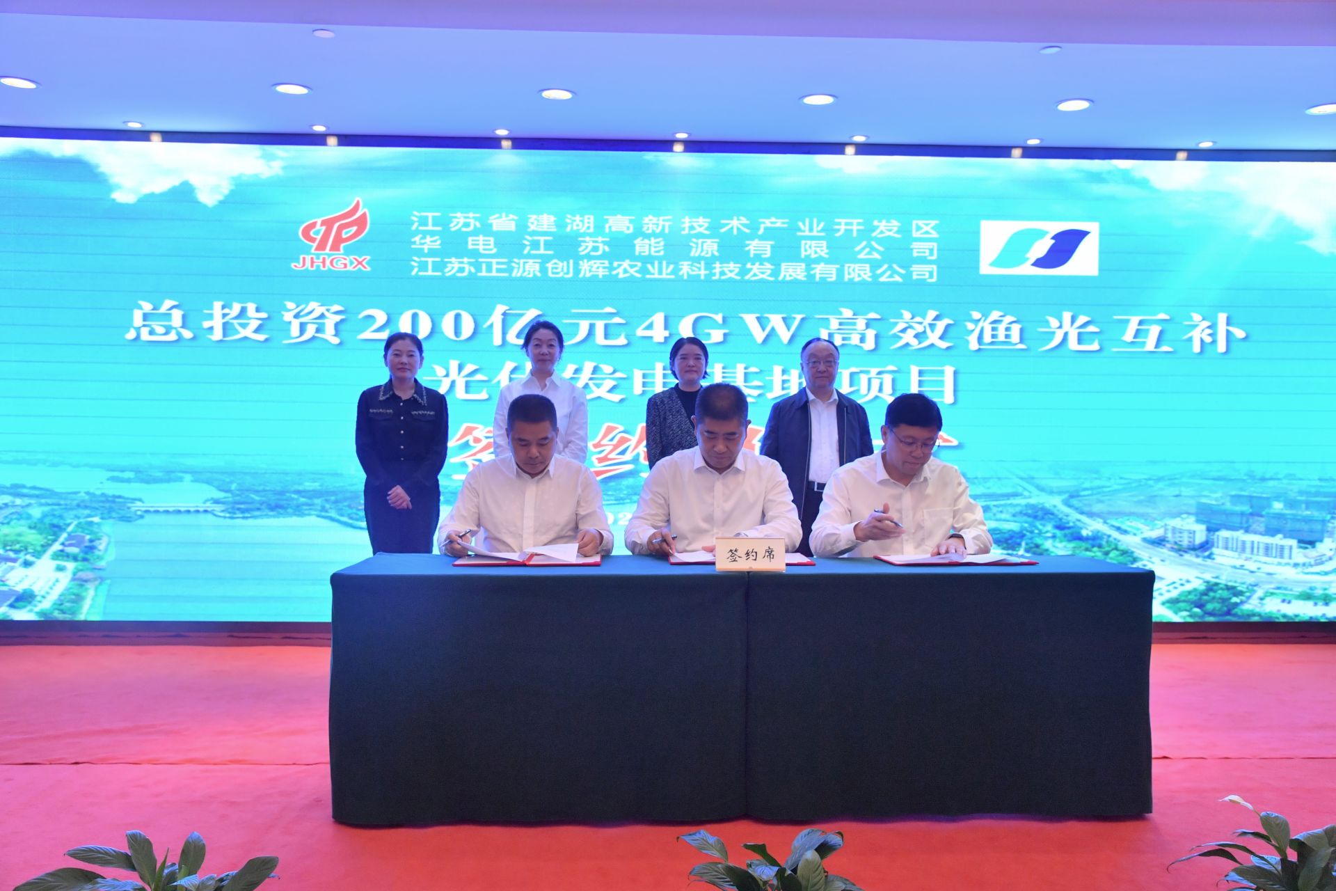 此次签约的华电能源光伏发电基地项目,拟利用建湖县渔业养殖水面8万亩,项目建设规模为全国“渔光互补”项目之最,是建湖县历史上单体投资最大的产业项目,打破了建湖百亿级项目“零”的记录。该项目建成后,每年可利用太阳能发电48亿度,每年减少二氧化碳排放375万吨,必将为建湖县进一步壮大能源产业规模、加快实现“碳达峰”“碳中和”提供有力支撑。