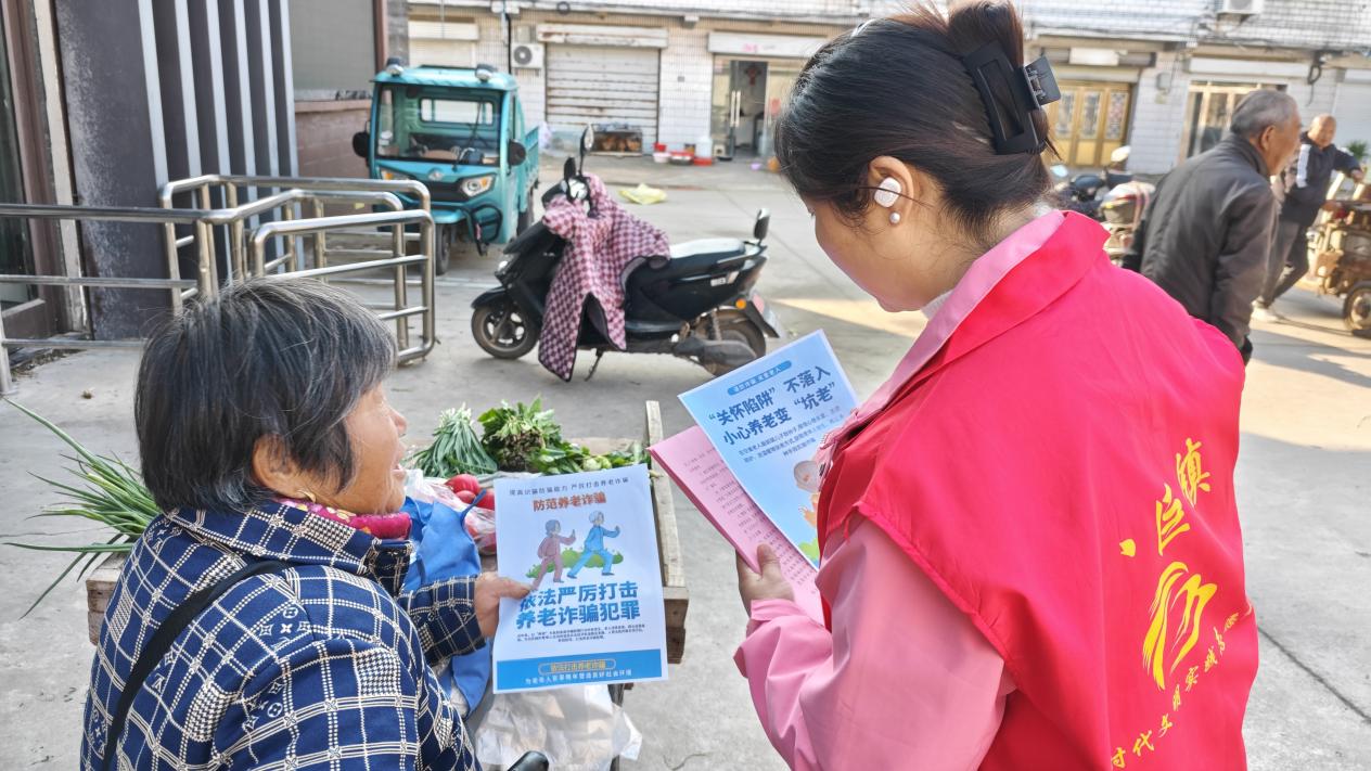 活动现场,志愿者走进辖区集镇的农贸市场、商贸超市及沿街商铺等老年人常去场所开展宣传,针对老年人心理防范意识不强、辨别能力较弱等特点,通过发放宣传单、现场讲解等方式宣传电信诈骗、养老诈骗的“套路”手法,叮嘱老人们切勿贪图小利,不要轻易透露个人及家人的身份信息。之后,志愿者走入村居老人家中,为老人及其家属发放倡议书,号召大家共同行动,捂好钱袋子,护好幸福家。最后,志愿者们现场帮助老人下载注册“国家反诈中心”APP,并发放辖区警务室的防诈骗名片,提醒老人发现涉嫌养老服务领域的诈骗线索,积极向公安等部门举报。