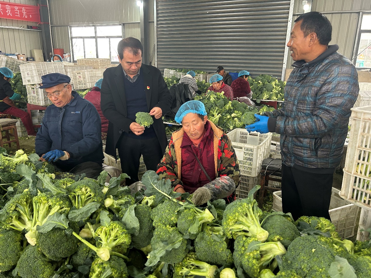 木楼村党总支书记顾乃东介绍说,木楼村位于黄河故道坎滩淤线南,四个镇区交汇处,近几年来,大力推进产业发展,在传统稻麦种植的基础上进行产业结构调,坚持“集中连片、规模发展、统一规划、示范带动”的原则,积极做好技术指导和政策服务,大力引进推广更新技术、更优品种,逐步扩大蔬菜种植面积。实施支部+基地+合作社、家庭农场+农户的发展模式,于2022年引进荣威家庭农场新农人陈其松,种植四青蔬菜青刀豆、毛豆、西兰花、大葱等约500亩,辐射带动周边群众种植,最多时每天提供周边群众务工机会一百多人,并与海大公司和滨海县恒茂果蔬合作社签订蔬菜初加工协议,盐城市人大代表恒茂果蔬合作社负责人王登铨,通过每年时段蔬菜初加工实体运行,吸纳附近村民到初加工基地务工,对年龄无要求、且是计量结算,所以非常有利于群众,不影响接送小孩、田间种植等,务工人员中最多的可为家庭增加收入30000多元,加工场面壮观,最多时候能有100多人,多次接待市县观摩。基地初加工厂地不仅增加合作社、农场经营经济收入,也给村集体经济积累有増加,更能提高群众收入,给群众在家门口提供就业渠道。