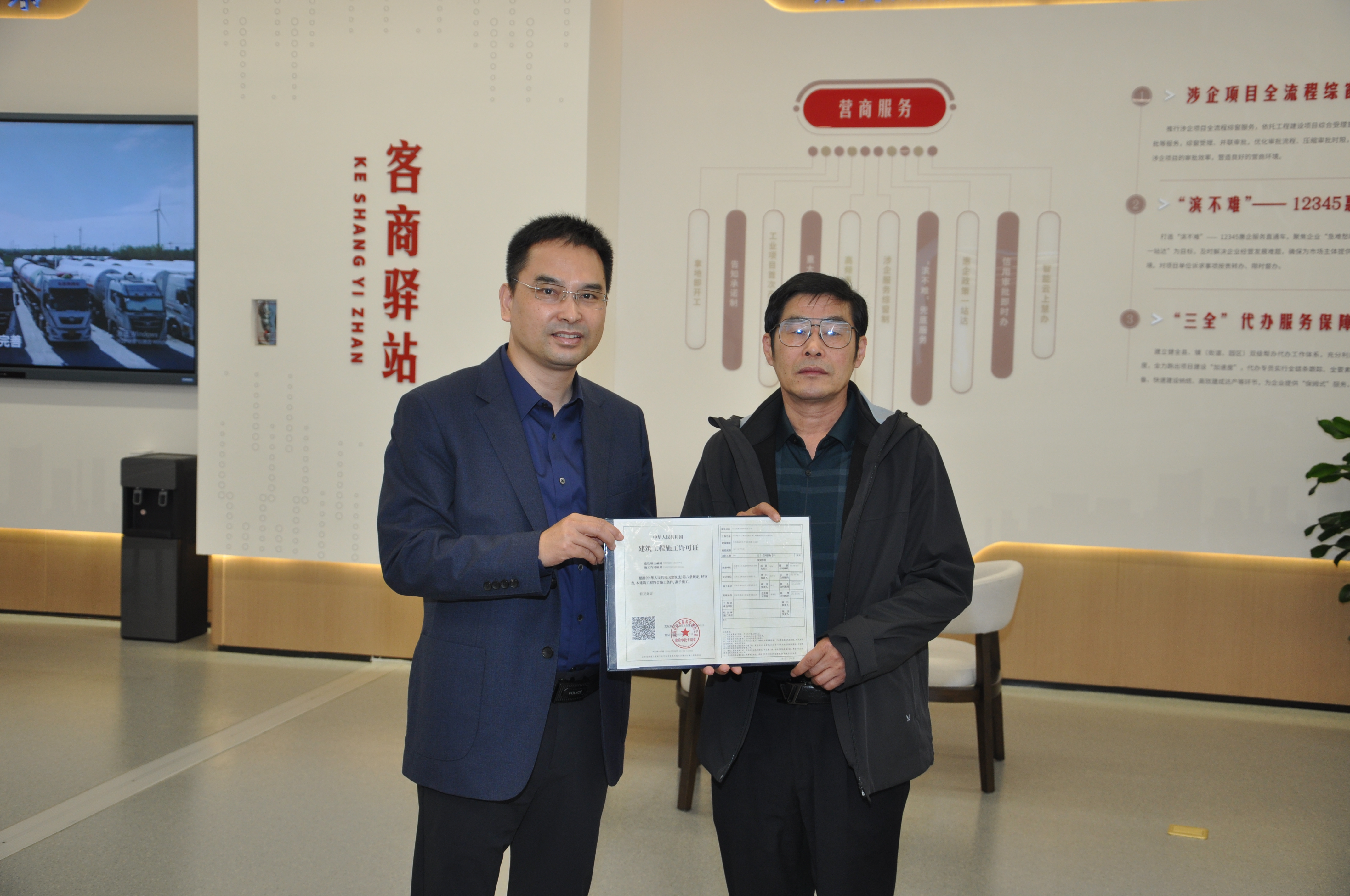 在项目取得施工许可证的关键节点,滨海县数据局主要负责同志主动靠前、亲自督办,全程参与项目申报指导与流程协调,有力推动施工许可审批提速增效,并在事项办结后,亲手将证书颁发给江苏皖维新材料有限公司夏明权经理,并现场承诺:“我们数据局将持续优化项目服务机制,全力保障皖维项目早建成、早投产、早达效。”这一暖心举措不仅彰显了滨海县对重大项目的高度重视,也传递出政务服务的温度和诚意。