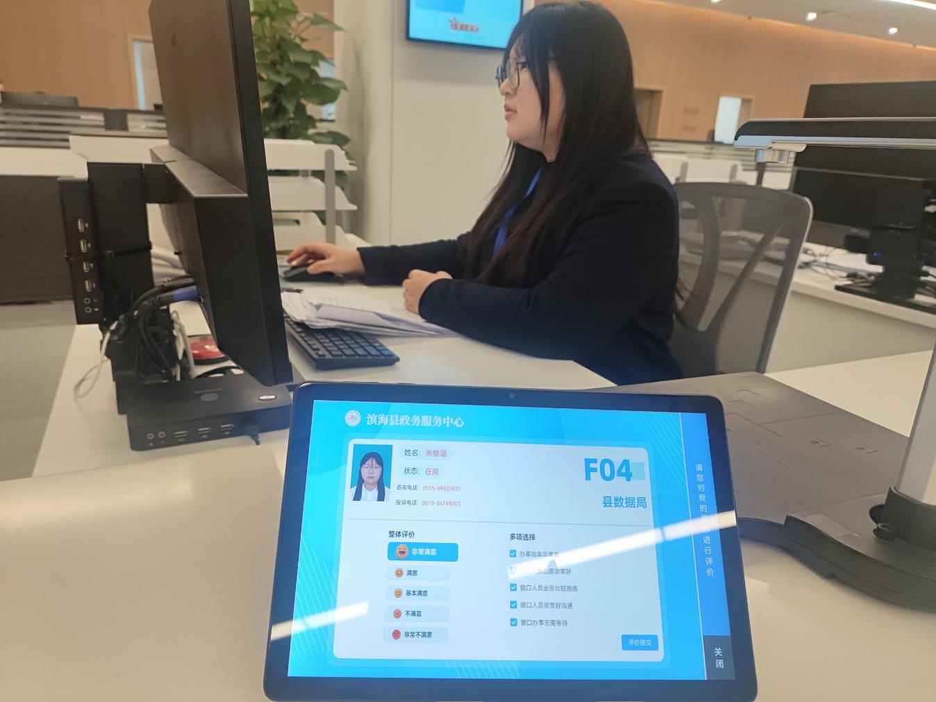 “现在办什么事跑趟大厅都能解决,操作也很简单,太方便了!”在滨海县政务服务大厅办完业务,张女士直接在窗口平板上点击“非常满意”,连连点赞。