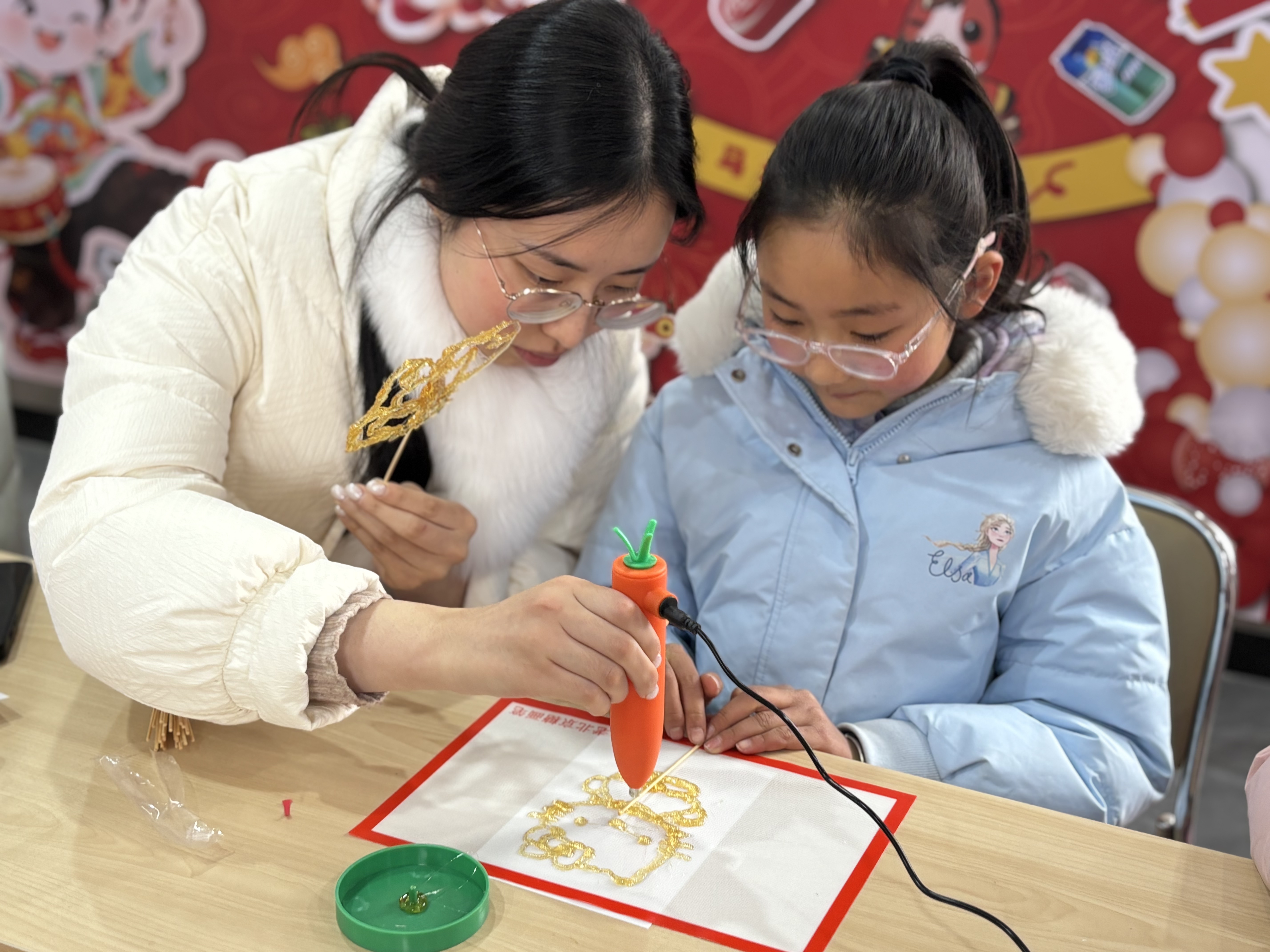 作为游园会的“热门项目”,套圈摊位前排起了长队。每组家庭手持10个套圈,瞄准心仪的奖品屏息凝神、精准投掷,欢呼声与喝彩声此起彼伏,套中奖品的家庭喜笑颜开,未中者也毫不气馁,在一次次尝试中享受互动乐趣。画糖画摊位前,非遗传承人手持融化的麦芽糖,以勺为笔、以糖为墨,在石板上快速勾勒,生肖马、小兔子、福字等造型栩栩如生,香甜的糖味弥漫在空气中,孩子们围在一旁目不转睛,接过晶莹剔透的糖画,满心欢喜地细细品尝。
