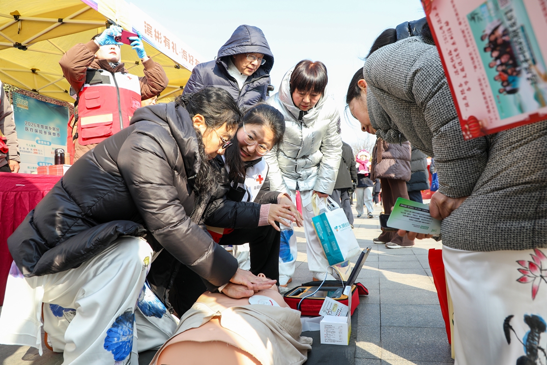 广场一角,滨海县红十字会的应急救护培训摊位前围满了人。“遇到有人晕倒,确认无意识后立即呼救并开始胸外按压,双臂伸直,用上半身力量往下压,节奏要快……”专业志愿者们通过人体模型,为市民现场演示心肺复苏、海姆立克急救法等实用技能,以及AED设备的规范使用方法,不少市民上前动手实操,“学一手,关键时刻或许能救命”的想法让大家学习热情高涨。