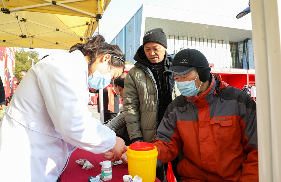 “大夫,我这两天头晕,是不是血压又高了?”“阿姨,光感觉不行,来坐下咱测测。”测完,医生没急着开“药方”,反而问:“腊肉吃多了吧?天冷盐罐子可别跟着‘加码’啊!”笑声中,一场关于低盐饮食和定期监测的微型科普课完成了,一旁的卫健医护人员为市民提供免费血压检测和健康咨询,并针对节日期间的饮食、作息给予贴心指导。