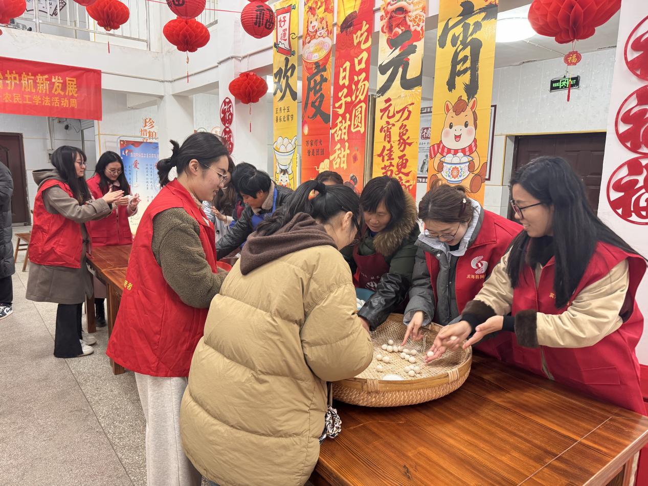 活动现场张灯结彩,红彤彤的灯笼、喜庆的元宵主题条幅将场地装点得格外温馨,处处洋溢着浓浓的节日氛围。在包汤圆环节,大家分工协作、默契配合,揉面团、搓汤圆、摆造型,个个动作娴熟、干劲十足。欢声笑语中,一颗颗圆润饱满的汤圆摆满竹匾,承载着满满的爱心,也凝聚着对孤寡老人的深切牵挂。