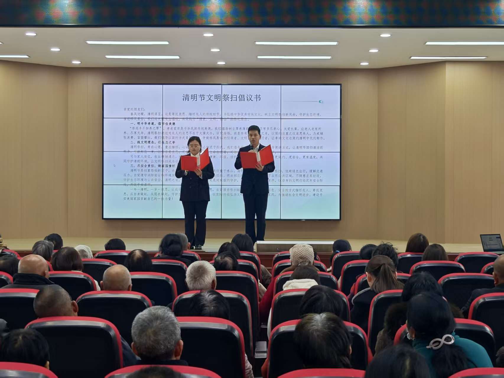随后,移风易俗节目展演精彩上演,将活动推向高潮。整场展演以“梨风清音”为脉络,将清明追思、红色传承、文明新风与本土文化深度融合,兼具思想性、艺术性与感染力。快板《移风易俗谱新章》节奏明快、朗朗上口,用接地气的唱词倡导鲜花祭扫、植树追思等文明低碳的祭扫方式,呼吁群众破除陈规陋习,让文明新风深入人心;笛子独奏《燕归来》旋律悠扬婉转,以清脆的笛声勾勒春日清明的唯美意境,传递对逝者的深切追思与对生命美好的向往;主题宣讲《铭记席永华烈士共绘永华新画卷》重温英雄事迹,细数永华村在英烈精神引领下的发展变迁,从昔日贫瘠乡村到如今产业兴旺、乡风文明的蝶变,让现场人员备受鼓舞;志愿者现场宣读《文明祭扫倡议书》,以真挚的话语发出倡议,号召大家以文明方式缅怀先人,让清明节日更添清新与温情。