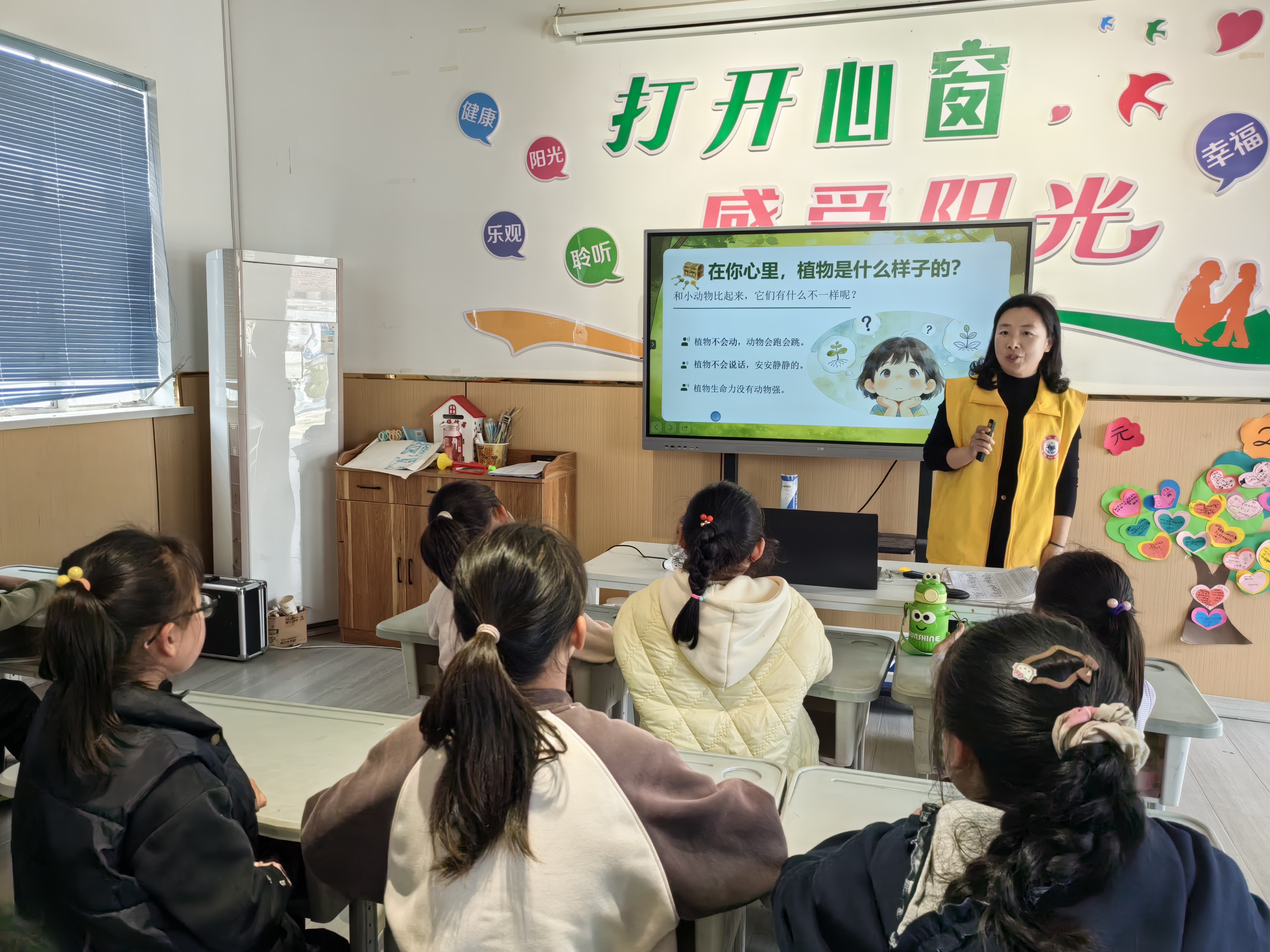 活动以“打开心窗,感受阳光”为基调,社工老师用生动有趣的方式,带领孩子们走进植物的世界,解锁植物身上的“心理密码”。课堂伊始,老师抛出问题:“在你心里,植物是什么样子的?和小动物比起来,它们有什么不一样?”孩子们纷纷举手分享自己的观察:“植物不会动,却能在风中静静生长”“植物不会说话,却有着顽强的生命力”。在轻松的互动中,孩子们初步感知到植物的坚韧与沉静。