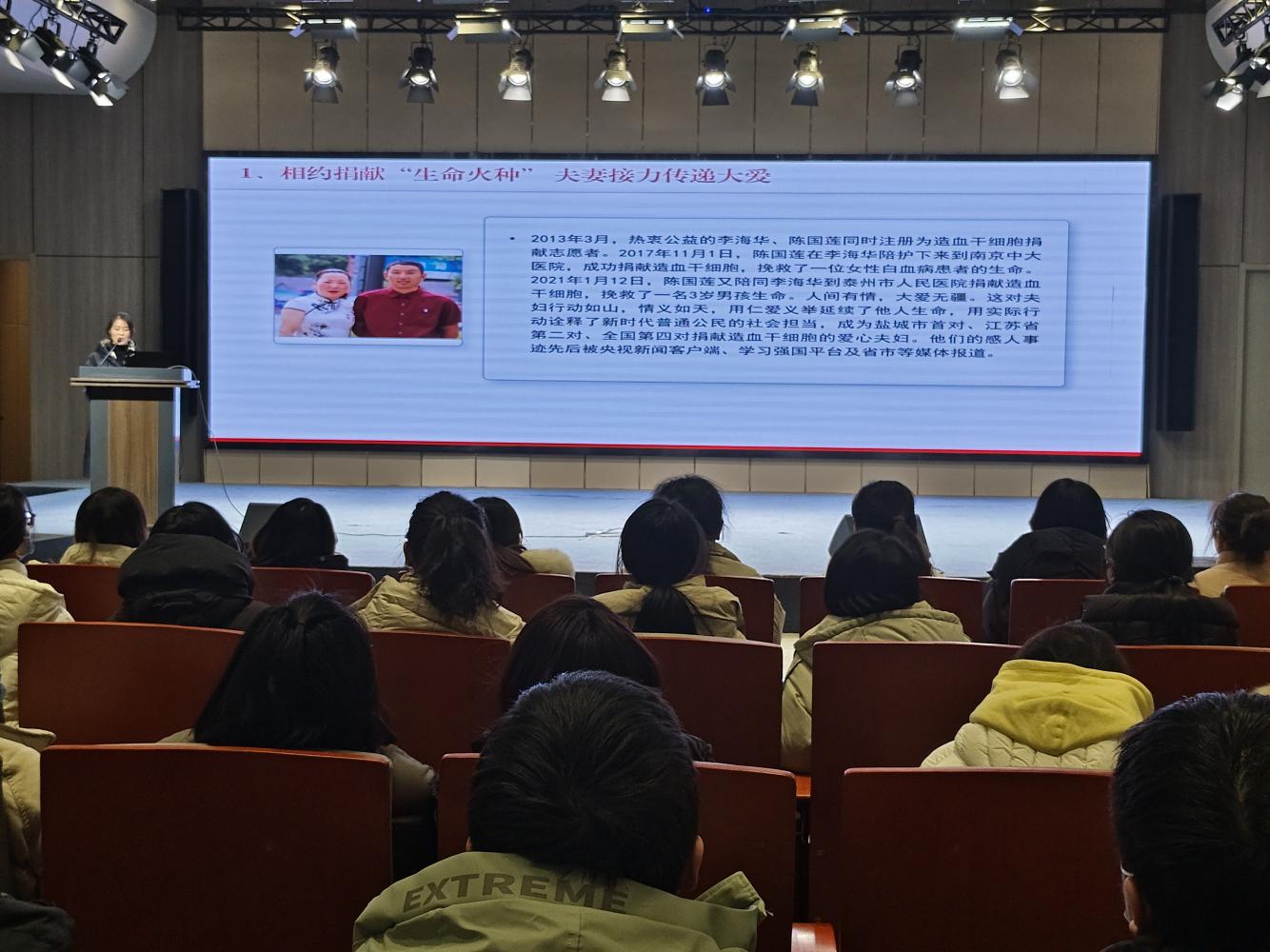 宣讲前,宣讲员首先介绍了举办这次活动的目的和意义,随后通过图文并茂的PPT,讲述了江苏好人李海华、陈国莲夫妇双双献爱心,成功捐献造血干细胞的先进事迹。