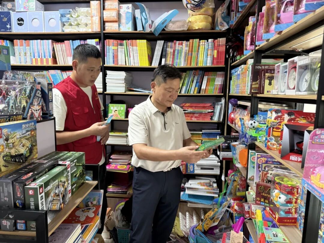 9月1日下午,秋学期开学伊始,盐南高新区新河街道宣传委员陈德天带领社区工作人员,深入辖区3家文具店开展开学季“扫黄打非”专项检查。通过翻阅店内图书,查看玩具与文具的外观及标识,以“扫黄打非”专项行动为抓手,切实筑牢校园周边文化安全防线,为学生营造健康的消费环境。