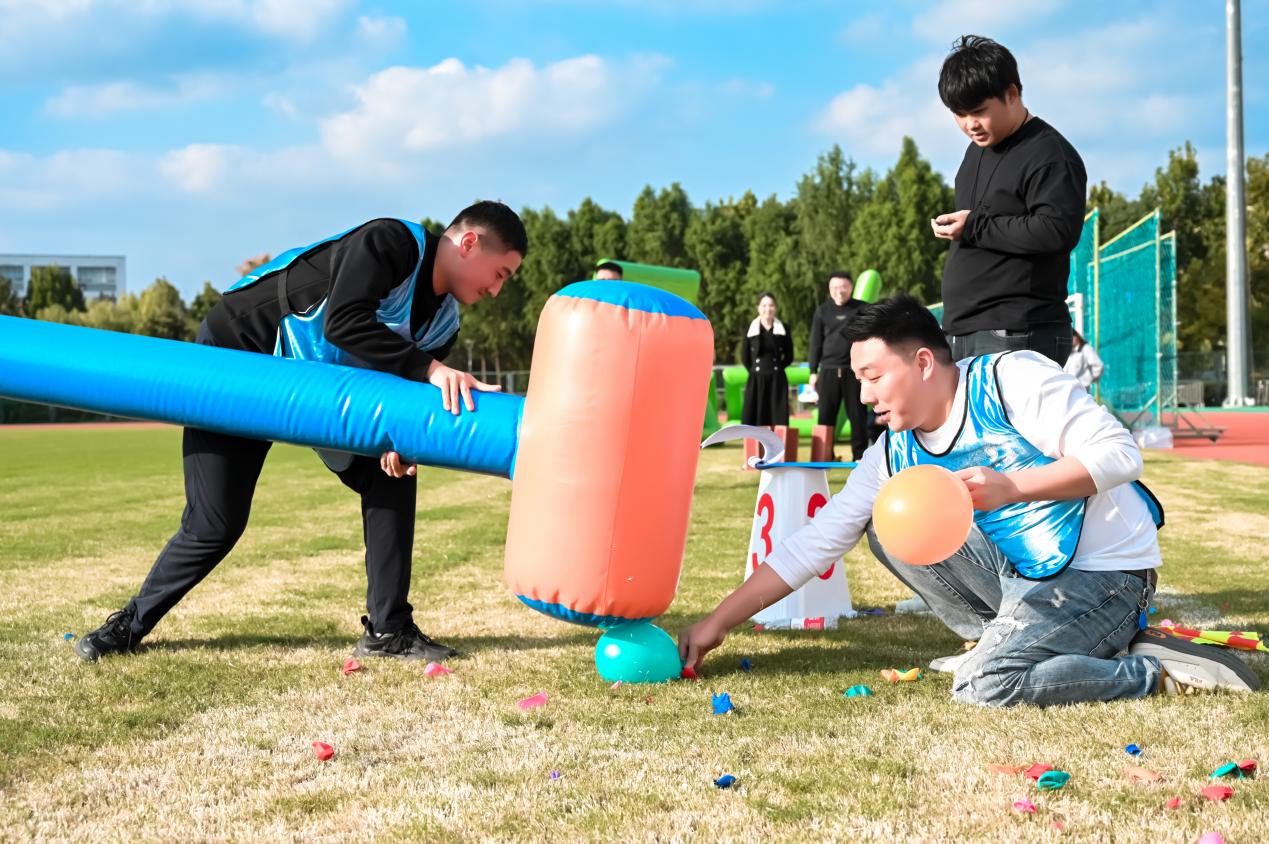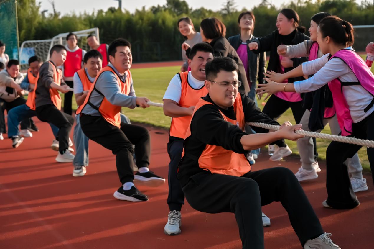 比赛开始后,各队运动员全力以赴、默契配合。在“俄罗斯方块”项目中,队员们疾速穿梭,精准拼接;在“一锤定音”现场,气锤挥落,掌声与欢呼声此起彼伏;“隔山打牛”环节,抛接动作尽显默契;“巨人脚步”项目,节奏统一、步调一致,彰显团队凝聚力;而压轴大戏“拔河”更是将气氛推向高潮,绳缆两端的激烈较量,展现了力量与意志的双重比拼。裁判员们恪尽职守,公正执裁,确保赛事有序进行;工作人员细致入微的服务,共同营造了和谐、热烈、文明的竞赛环境。