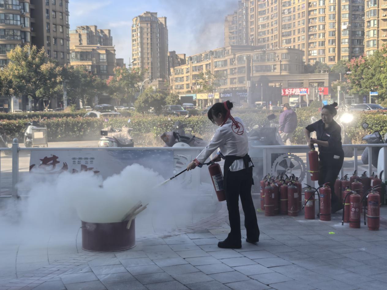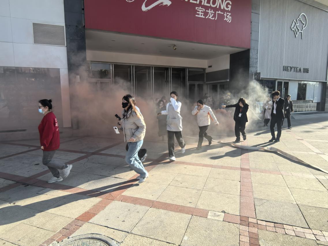 实操演练环节中,随着模拟火情信号发出,商圈内立即启动应急响应预案。在安全员的指导下,现场人员用湿毛巾捂住口鼻,沿安全通道弯腰低姿快速疏散至指定安全区域;一边熟练操作灭火器对准火焰根部进行扑救,整个过程紧张有序、配合默契,充分展现了前期培训的成效。