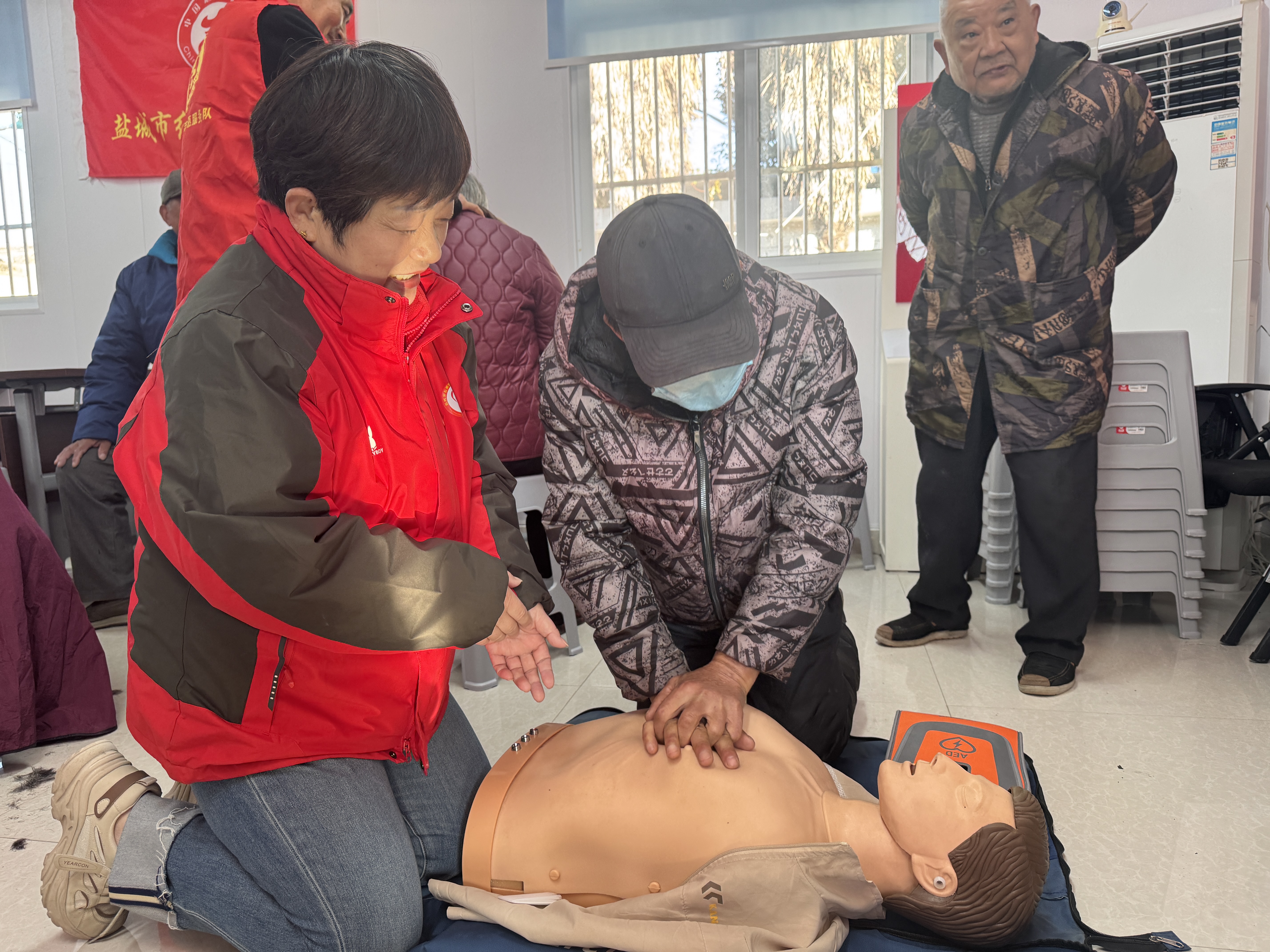 在社区活动现场,宏武志愿服务队队长孙宏武针对老年人应急需求,开展AED急救演练,通过实物模拟,细致讲解操作流程与心肺复苏步骤。72岁的李爷爷实操后感慨:“以前觉得急救是医生的事,今天学会了,关键时候能救命,回家还得教老伴儿!”在志愿者指导下,老人们快速掌握急救技能。