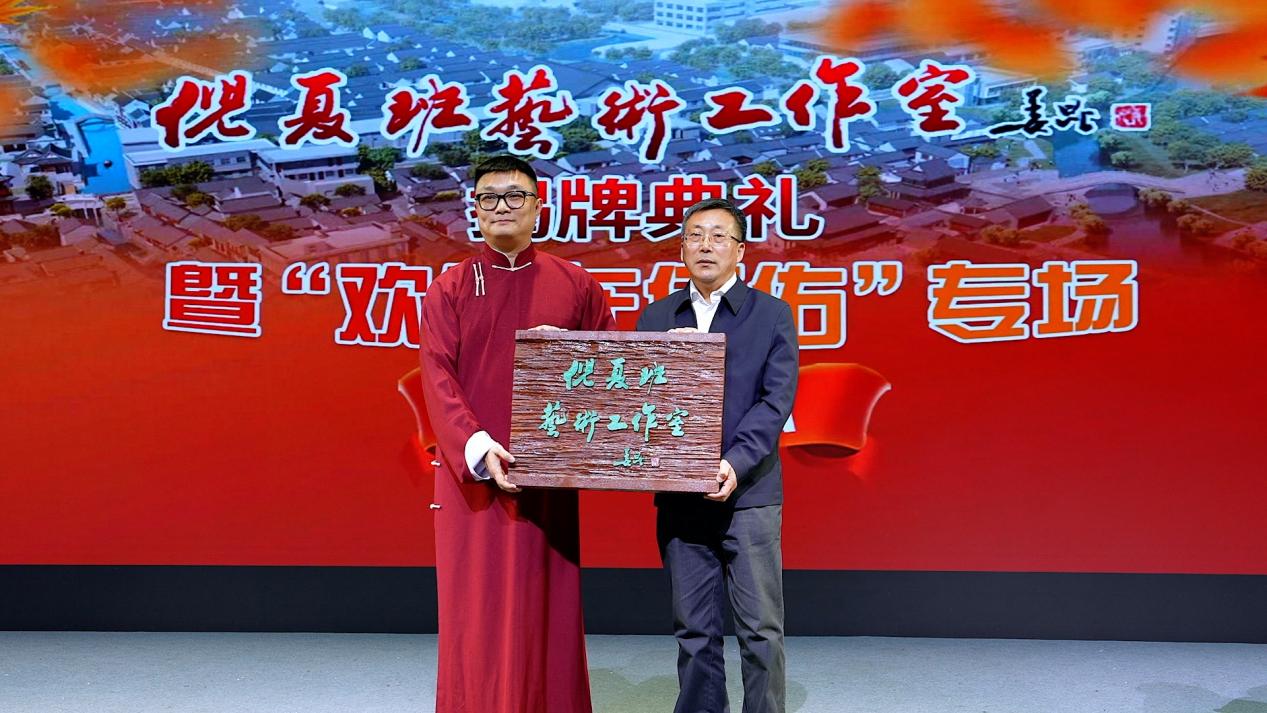 在所有人的注视下,蒋东仁院长和南京群星相声艺术团团长、倪夏班班主倪夏宇共同揭牌,由著名相声表演艺术家姜昆先生题写的“倪夏班艺术工作室”牌匾上的几个大字金光闪闪、引人注目。用倪夏宇的话来说:师爷姜昆先生提写的不仅是字,更是老一辈艺术家对我们后辈的殷切期望,更是曲艺事业薪火相传的象征。