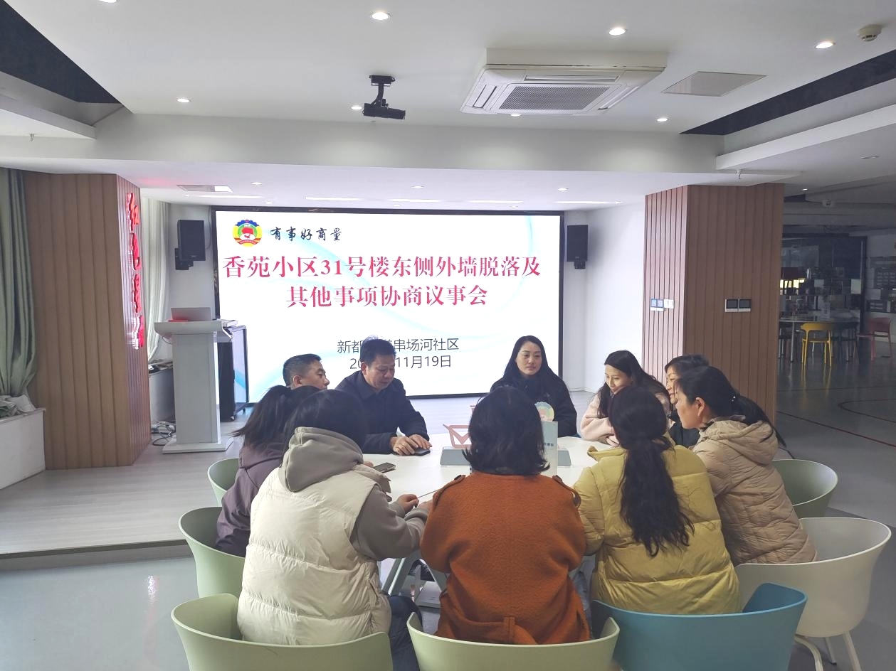 为消除住宅楼外墙脱落安全隐患,防范高空坠物风险,切实守护居民群众“头顶上的安全”,近日,新都街道串场河社区召开专题协商议事会,组织社区负责人、物业、网格员及居民代表,就香苑安置小区外墙饰面松动脱落问题开展集中协商。