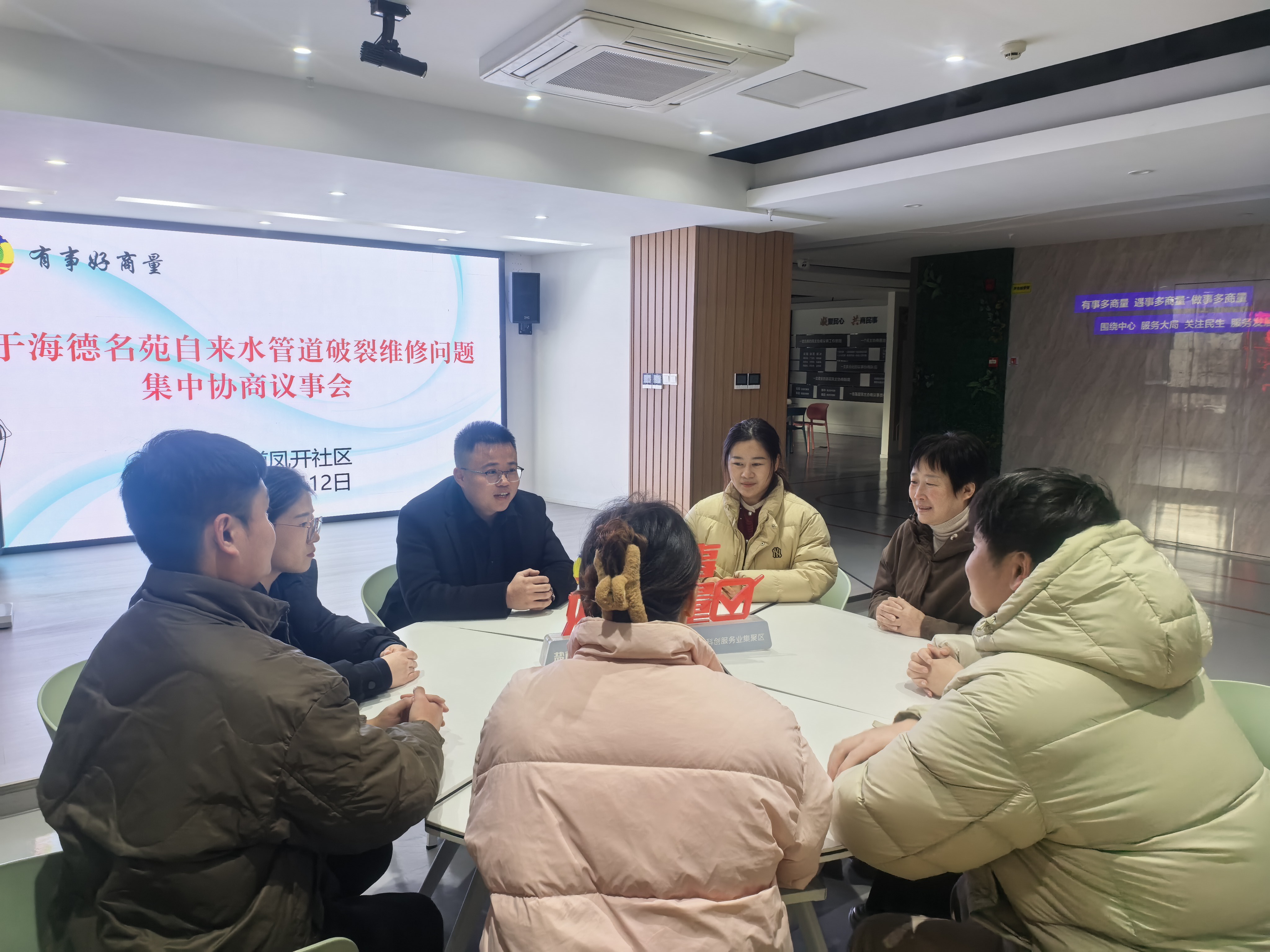 为切实保障居民日常生活用水安全,及时消除老旧小区基础设施安全隐患,有效解决群众急难愁盼问题,近日,新都街道凤开社区召开“有事好商量”专题协商议事会,聚焦海德名苑小区自来水管道破裂修复问题,社区负责人、物业公司代表、居民代表、网格员共同商讨解决方案。经过充分交流与民主协商,会议就修复工作的牵头主体与实施单位达成一致意见。