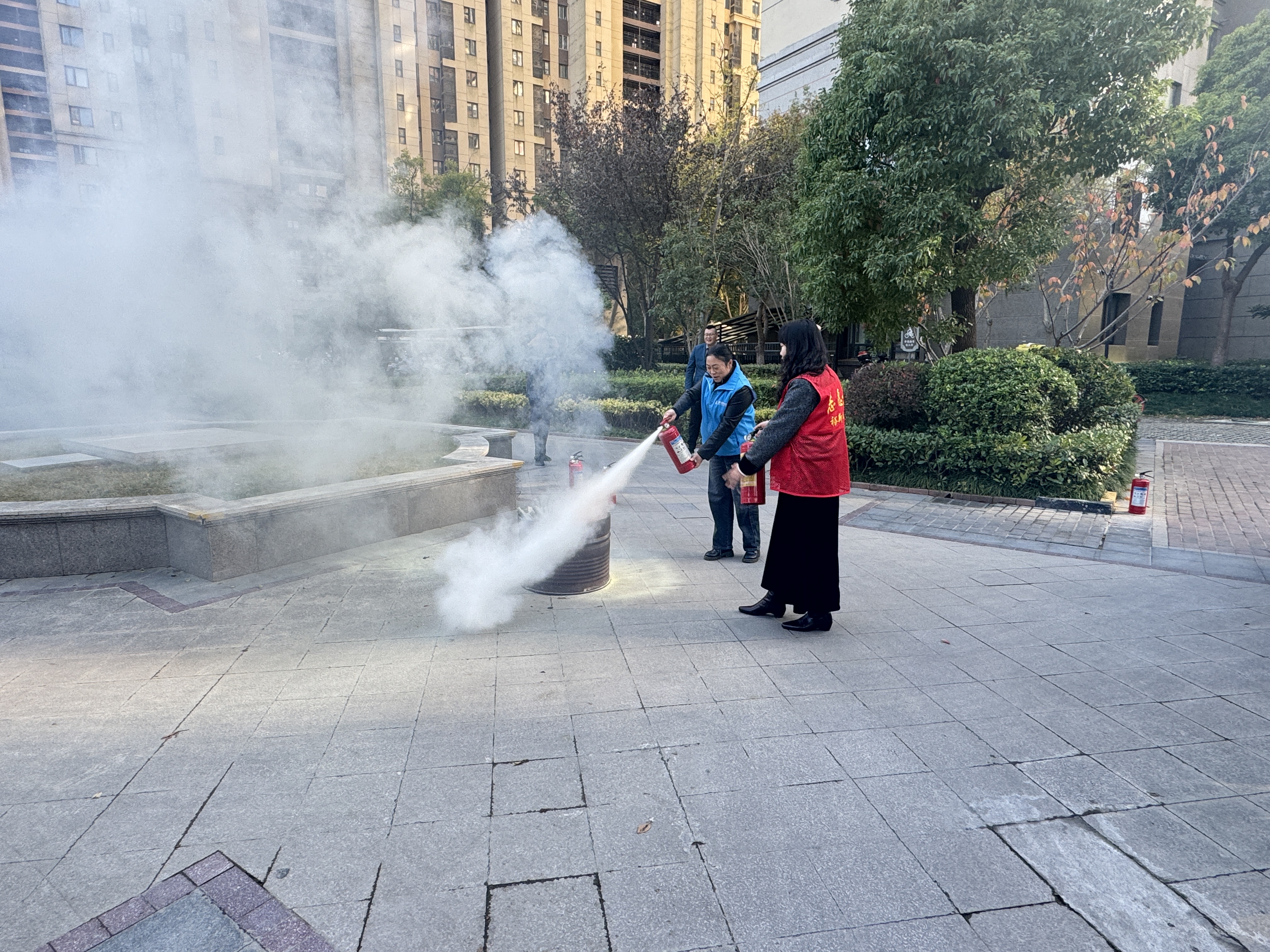 演习中,网格员结合典型火灾案例,向在场居民讲解了火灾成因、日常防火注意事项以及灭火器、消防水带的正确使用方法。同时着重强调火灾逃生“低姿弯腰、湿毛巾捂口鼻、不乘坐电梯”等核心要点,让居民牢记逃生要领。在灭火实操环节,居民代表在安全员的一对一指导下,亲身体验灭火器的操作流程,从拔销、对准火源根部到按压喷射,动作规范流畅,切实掌握了灭火技巧。