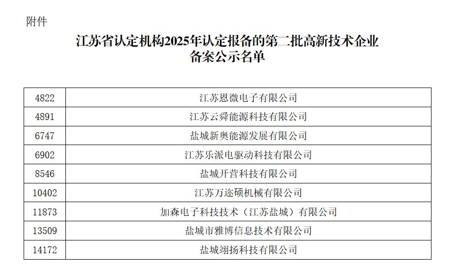 日前,2025年国家高新技术企业认定结果正式公布,盐南高新区街道科技创新工作再结硕果,共有12家企业成功通过认定。其中,第一批3家,第二批9家,申报通过率及总量均稳步提升,充分展示了科城区域科技创新的强劲活力。