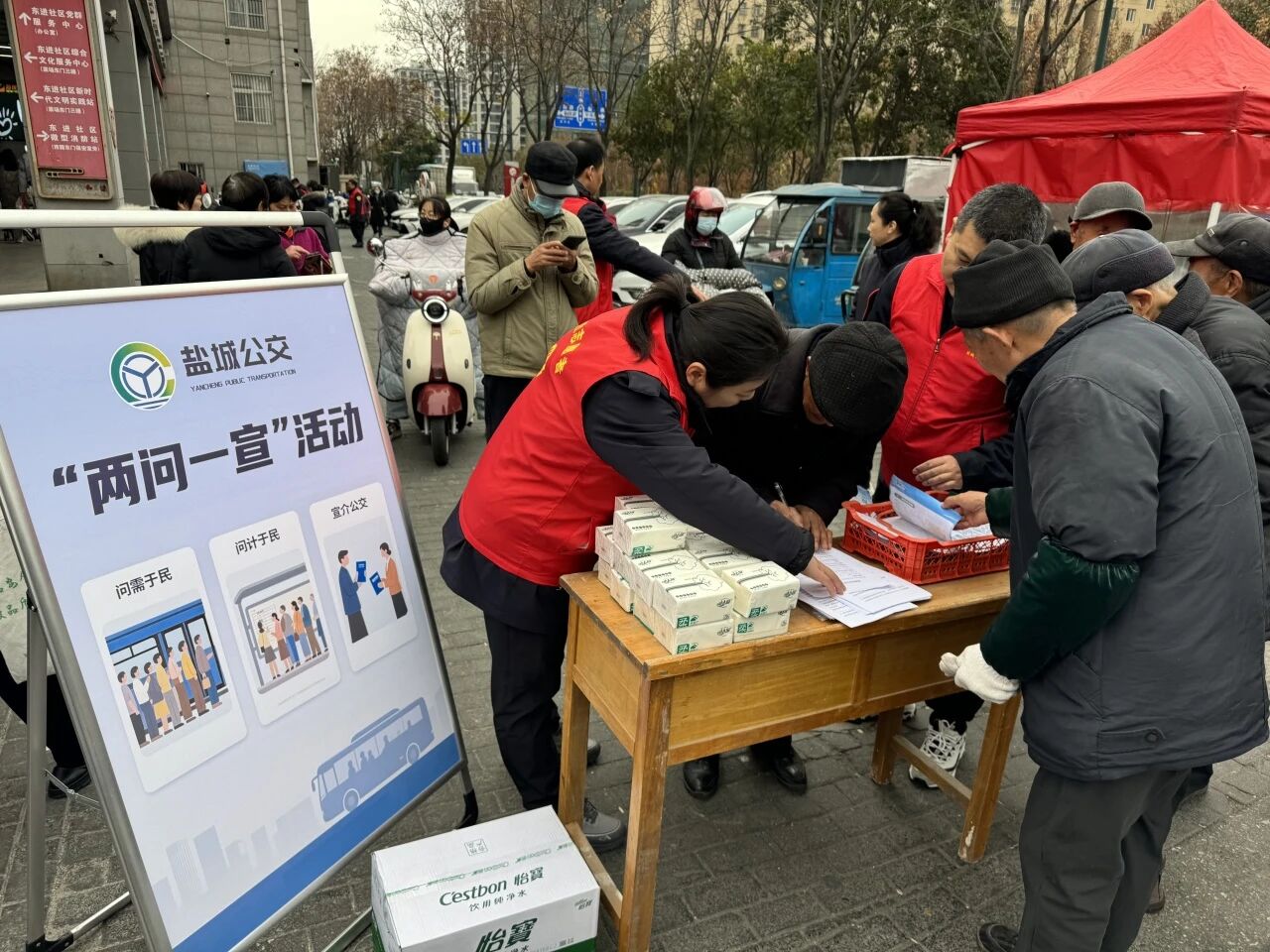 2025年12月23日,盐南高新区科城街道东进社区特邀盐城公共交通二分公司,在光明花苑小区举办“公交服务进社区,便民出行零距离”——“两问一宣”志愿服务活动,通过政策咨询、智能服务指导与线路信息解读等便民举措,进一步倡导绿色出行理念,提升社区服务水平,把便捷高效的公交服务送到居民家门口。