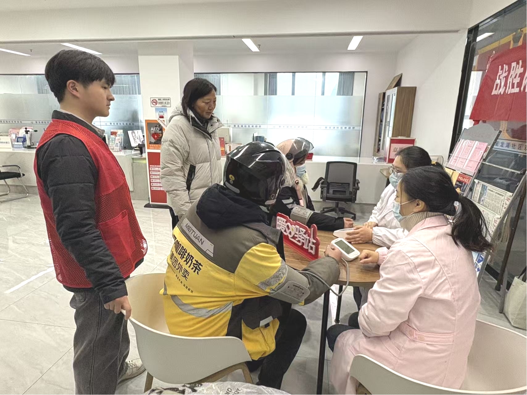 除了基础的便民服务,聚龙湖社区还依托暖心驿站,定期开展多样化的关爱活动。在每月1次的健康义诊现场,来自辖区卫生院的医护人员为户外劳动者们免费测量血压、血糖,耐心解答关于颈肩腰腿痛、肠胃疾病、慢性病防治等方面的健康咨询,并根据每个人的身体状况给出个性化的调理建议和用药指导。针对外卖小哥、快递员长期骑行、饮食不规律的职业特点,医护人员还专门普及了交通安全防护知识和科学膳食、合理作息的健康常识,帮助大家养成良好的生活习惯。