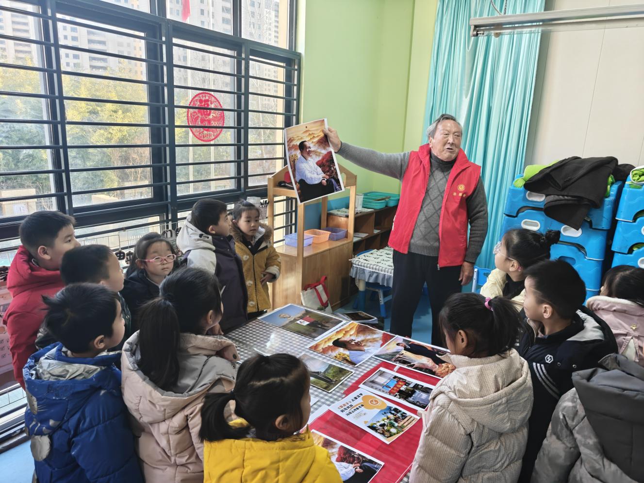 活动以适合幼儿年龄特点的生动形式展开。社区五老志愿者孙爷爷将一幅幅描绘革命历程的红色画册按顺序细心排列,以“故事长廊”的形式呈现在孩子们面前。孩子们目不转睛地看着画册,津津有味地听着孙爷爷讲的故事,仿佛跟随画面穿越到了那段峥嵘岁月。并用通俗易懂的语言,为孩子们讲述了毛主席等革命先辈的感人小故事,引领孩子们感受那段艰苦奋斗的岁月。