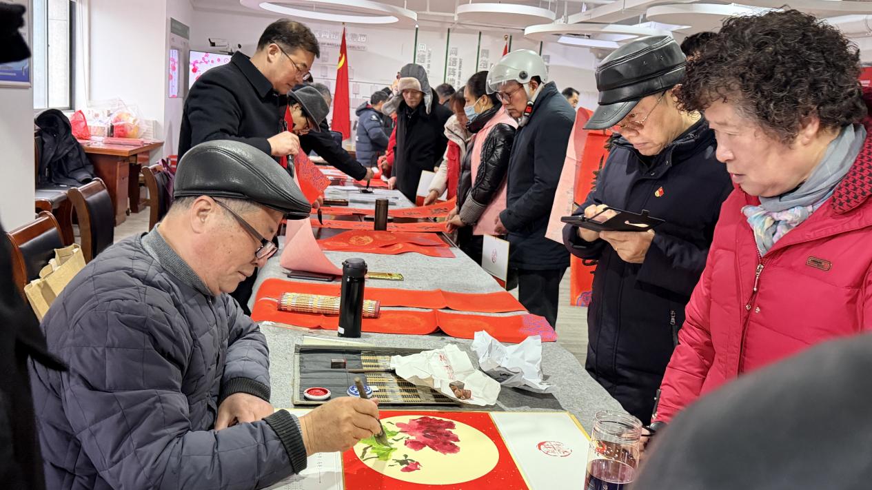 下午两点半,活动在悠扬的传统民乐声中拉开序幕。活动现场,几位特邀书画名家挥毫创作,引得居民驻足欣赏。刘老师笔下牡丹雍容绽放,墨色浓淡相宜,寓意富贵平安;蔡老先生挥就春联笔走龙蛇,“门迎百福”“户纳千祥”等祝福跃然纸上,楷行隶各体皆工,赢得阵阵赞叹。“手写春联比印刷的更有温度!”手持墨香未干春联的张阿姨欣喜说道。居民们或细观创作,或挑选联语,或交流新年期盼,活动现场暖意融融。