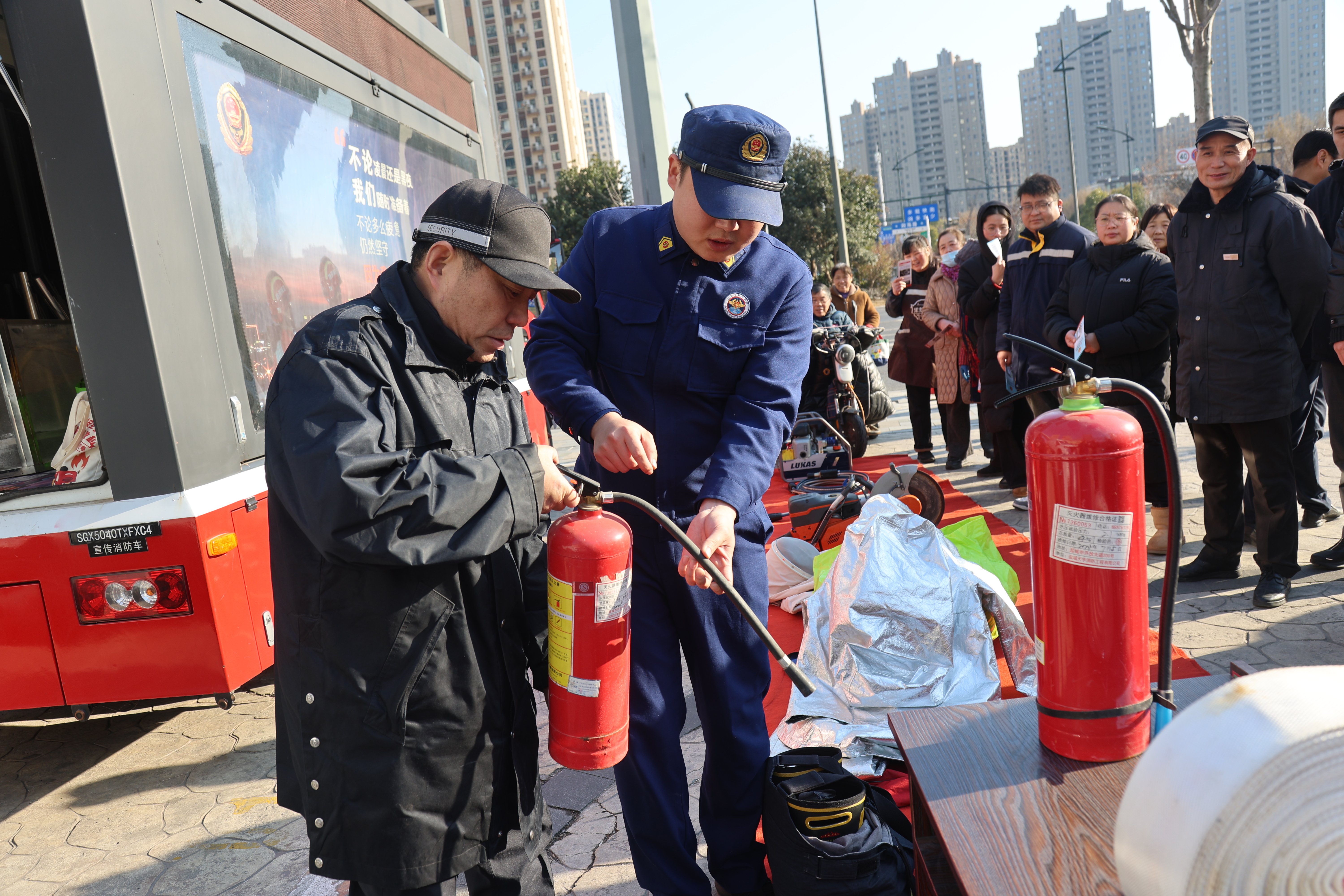 互动体验环节氛围格外活跃,居民们积极踊跃地尝试穿戴消防服装、拼接消防水枪、喷射灭火器等,在工作人员的指导下亲手操作消防器材,沉浸式感受消防工作的专业性与重要性。