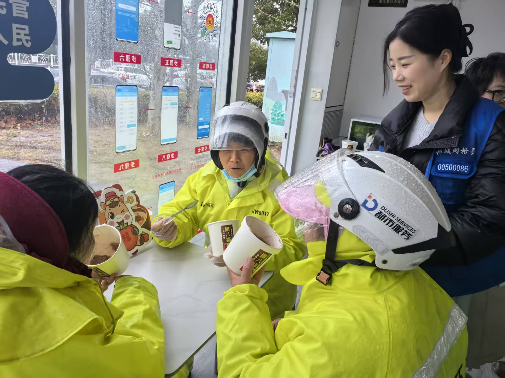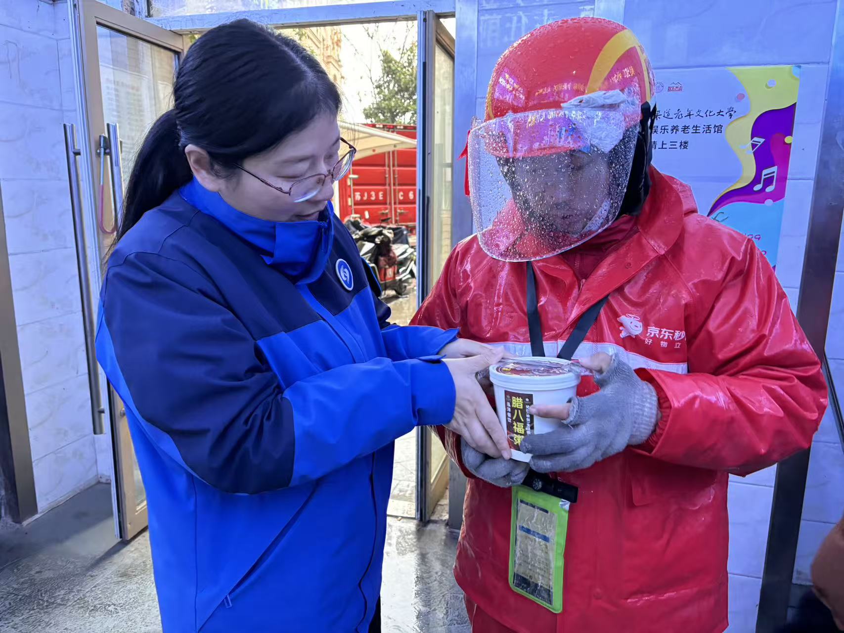 “师傅,辛苦了!喝碗热粥暖暖身子!”接过志愿者递来的餐盒,外卖骑手小王来不及擦拭额头的雨水,便迫不及待尝了一口,感慨地说,“跑了一早上单子,手脚都冻僵了。喝下你们送来的腊八粥,我感觉浑身都热乎了!”