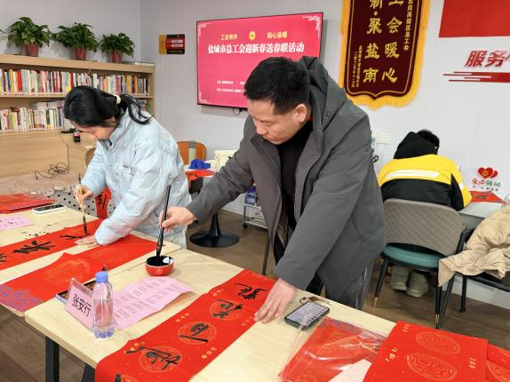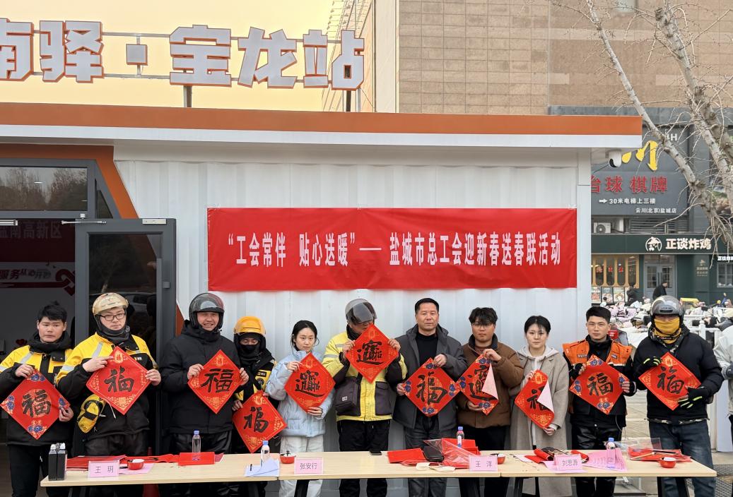 近日,黄海街道宝龙社区携手盐城市总工会,在“红印宝龙”暖心驿站举办“工会常伴贴心送暖”迎新春送春联活动,为奔波在一线的外卖小哥送去满满的新春祝福。