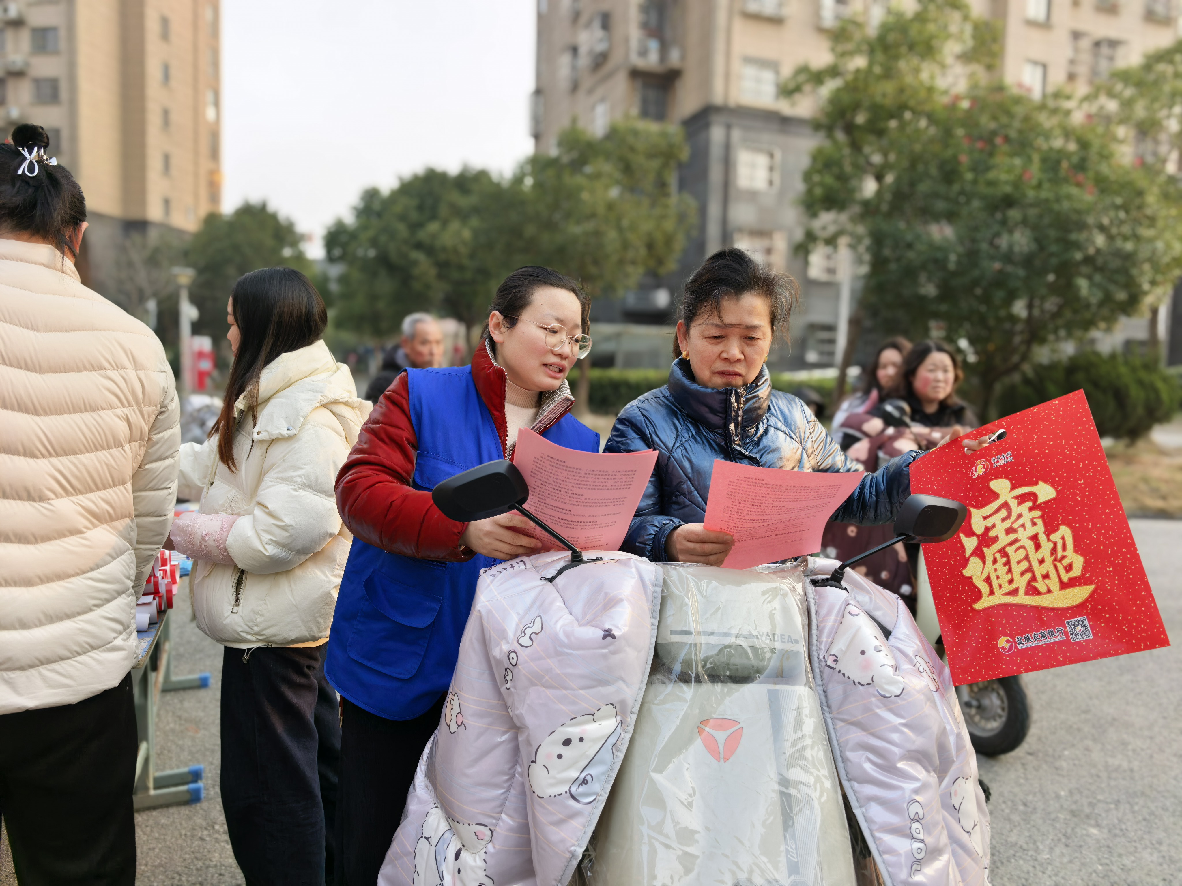 春节将至,外出务工人员集中返乡,盐南高新区伍佑街道联合区社保中心,以“养老保险进万家政策温暖你我他”为主题,在辖区珠溪铭苑小区开展“暖心居保、幸福养老”集中宣传咨询活动,把养老政策与新春祝福送到居民家门口。