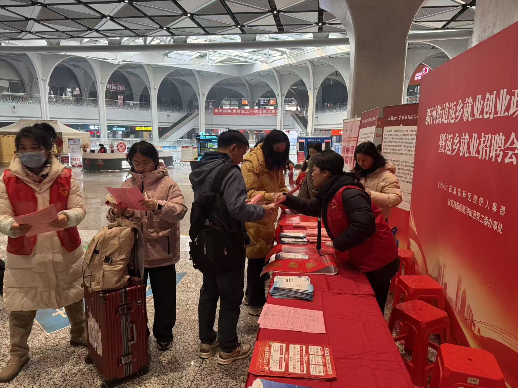 年关将至,外出务工人员返乡潮来临,为进一步发挥盐城高铁站人员集散的区位优势,扩大返乡就业创业等政策宣传影响力,积极做好创业就业服务工作,日前,盐南高新区组织人事部联合新河街道在盐城高铁站西广场举办返乡就业创业政策宣传暨返乡就业招聘活动。