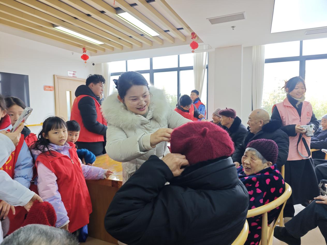 在在街道敬老院,老人们试戴起新帽子,彼此看着,脸上都绽开了笑容,平日宁静的院子一时间充满了欢声笑语。一顶顶色彩靓丽而温暖的帽子,仿佛是严冬里跃动的火苗,照亮了老人们慈祥的面庞,也驱散了季节的凛冽。