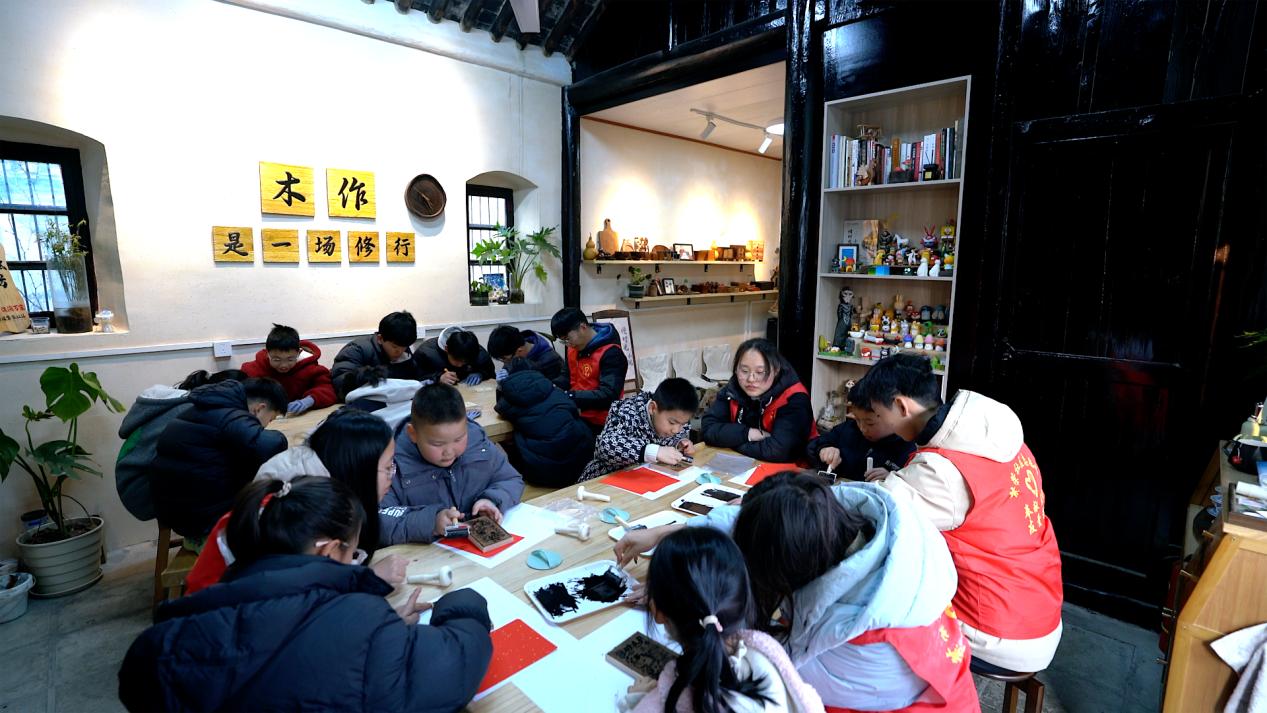 在木雕拓印区,孩子们在匠人指导下,与志愿者携手合作,蘸墨、铺纸、轻拓、压印,一笔一画、一按一压间,将吉祥福字与传统纹样跃然纸上,完成一幅幅充满年味的新年拓福作品。